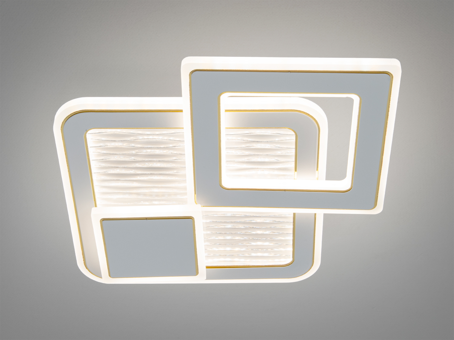 Світильник виконано у лаконічній сучасній естетиці: чистий білий колір і геометрична композиція трьох модулів формують цілісну світлову площину. Такий підхід забезпечує комфортну яскравість без виражених гарячих точок і допомагає підтримувати візуальний порядок у просторі. Невелика висота корпусу робить модель доречною в кімнатах із стандартною висотою стелі.
