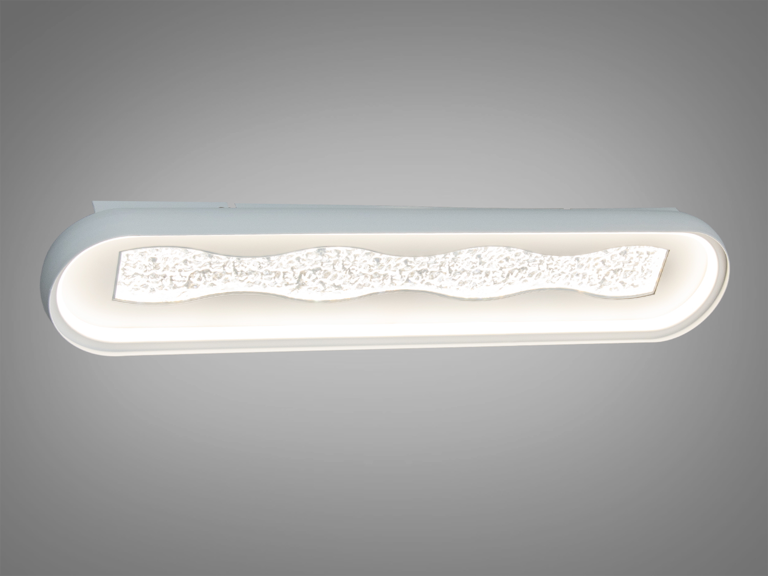Розсіювач з акрилу з текстурою хвилі пом’якшує відблиски та допомагає створити рівномірне, візуально комфортне освітлення. Прямокутна геометрія підкреслює сучасний характер моделі, а біле порошкове покриття металевого корпусу гармонійно поєднується з плиткою у ванній, фарбованими стінами коридору чи спальнею у світлих тонах.