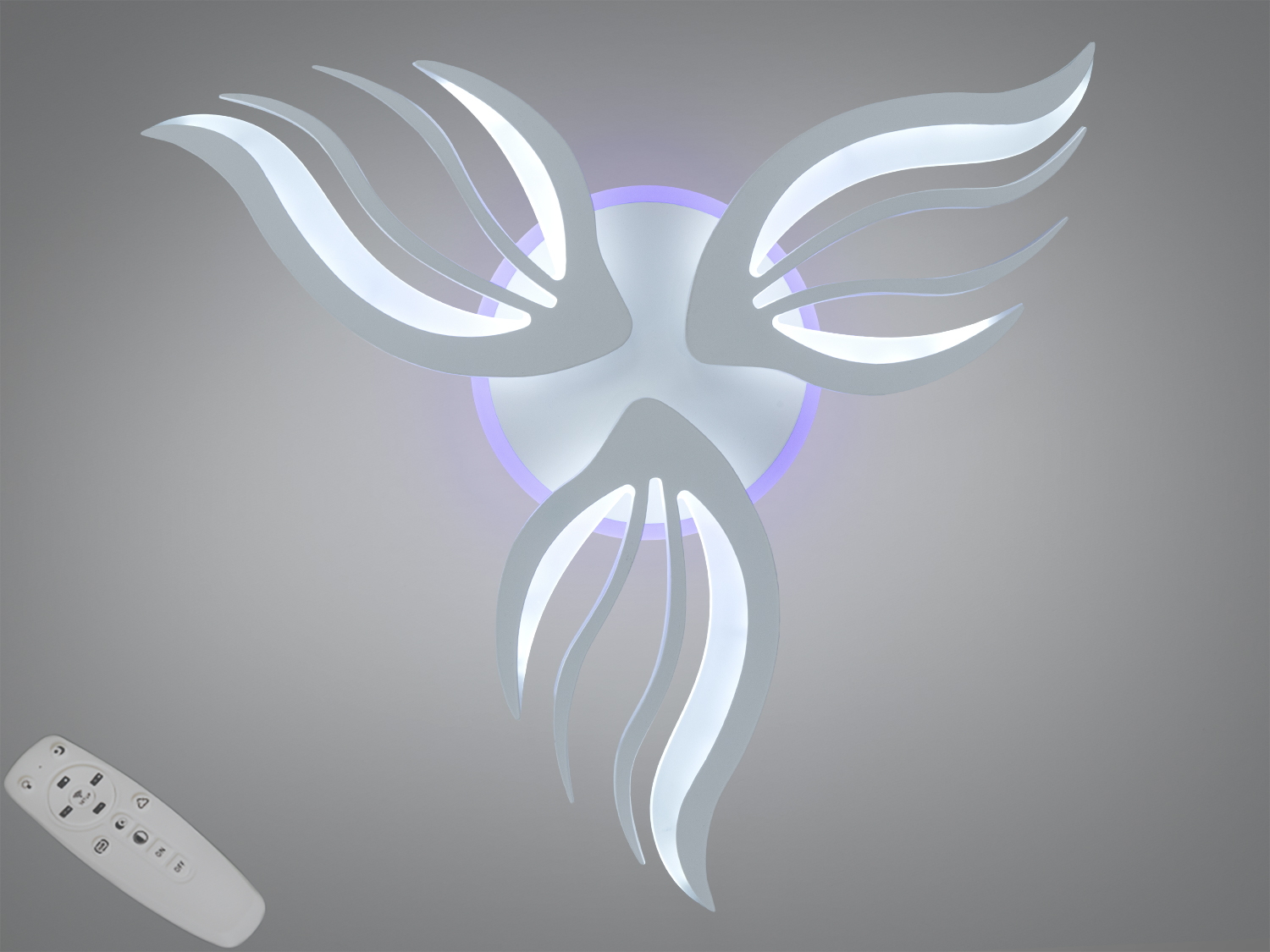 Стельова світлодіодна люстра Diasha у кольорі хром поєднує плавні хвилясті лінії та продуману функціональність. Три світлові модулі, виконані у формі пелюсток, формують виразний об′єм і м′яко розсіюють світло. Вбудована триколірна підсвітка основи дозволяє перемикати відтінок між теплим, нейтральним і холодним. Потужність 52 Вт розрахована приблизно на до 9 м², що зручно для компактних кімнат або окремих зон у більш просторих приміщеннях. Керування здійснюється з комплектного пульта дистанційного керування.