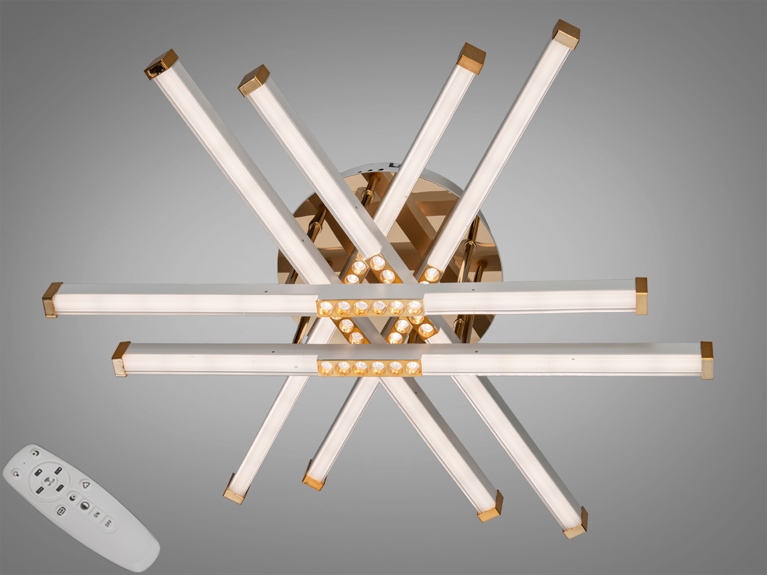 Ця стельова світлодіодна люстра у виконанні білий+білий створює рівномірне загальне освітлення та підкреслює сучасний характер інтерʼєру. Конструкція з 6 лінійних світлових модулів формує виразну графіку на стелі: перехресне або зіркоподібне розташування елементів допомагає отримати мʼякий, безперервний світловий контур без різких тіней. Потужність 80 Вт розрахована на ефективне освітлення площі приблизно до 14 м², що припускає використання у більшості кімнат стандартних квартир і приватних будинків.