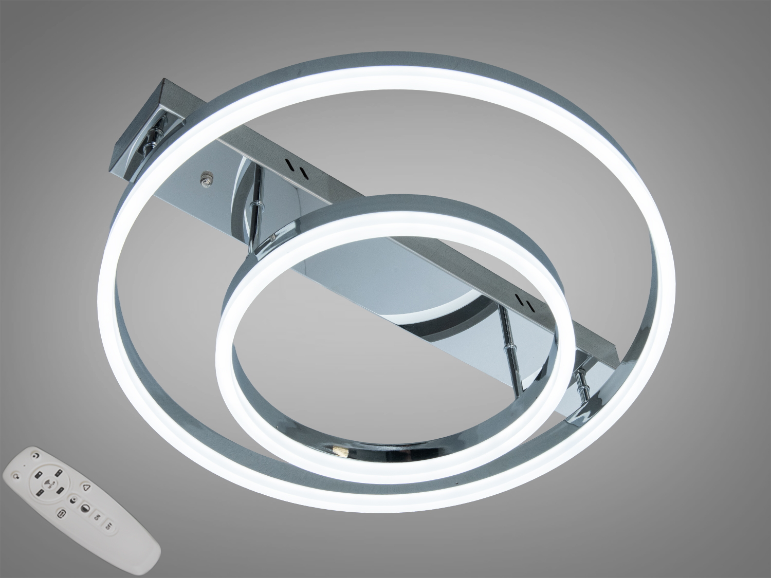 Висновок: стельова світлодіодна люстра Diasha у матовому хромі з двома кільцями та пультом — практичне рішення для кімнат близько 9 м². Димер і перемикання відтінків світла допомагають налаштувати освітлення під будь-який сценарій: робота, відпочинок чи зустрічі з друзями.