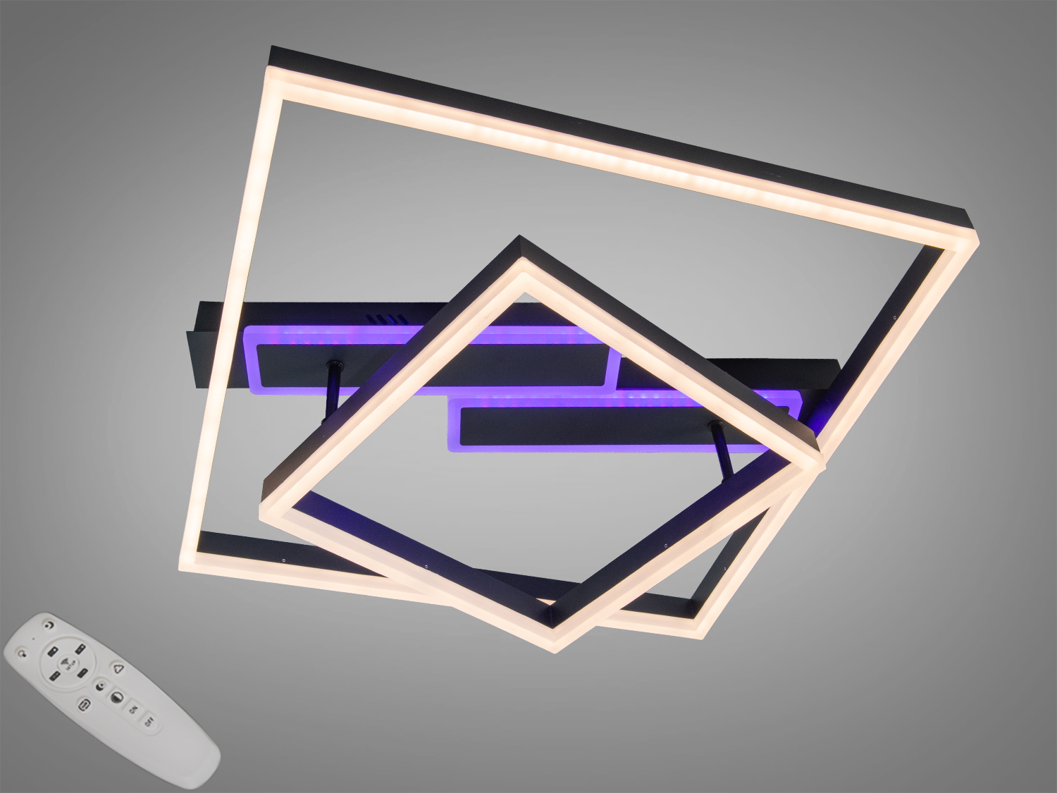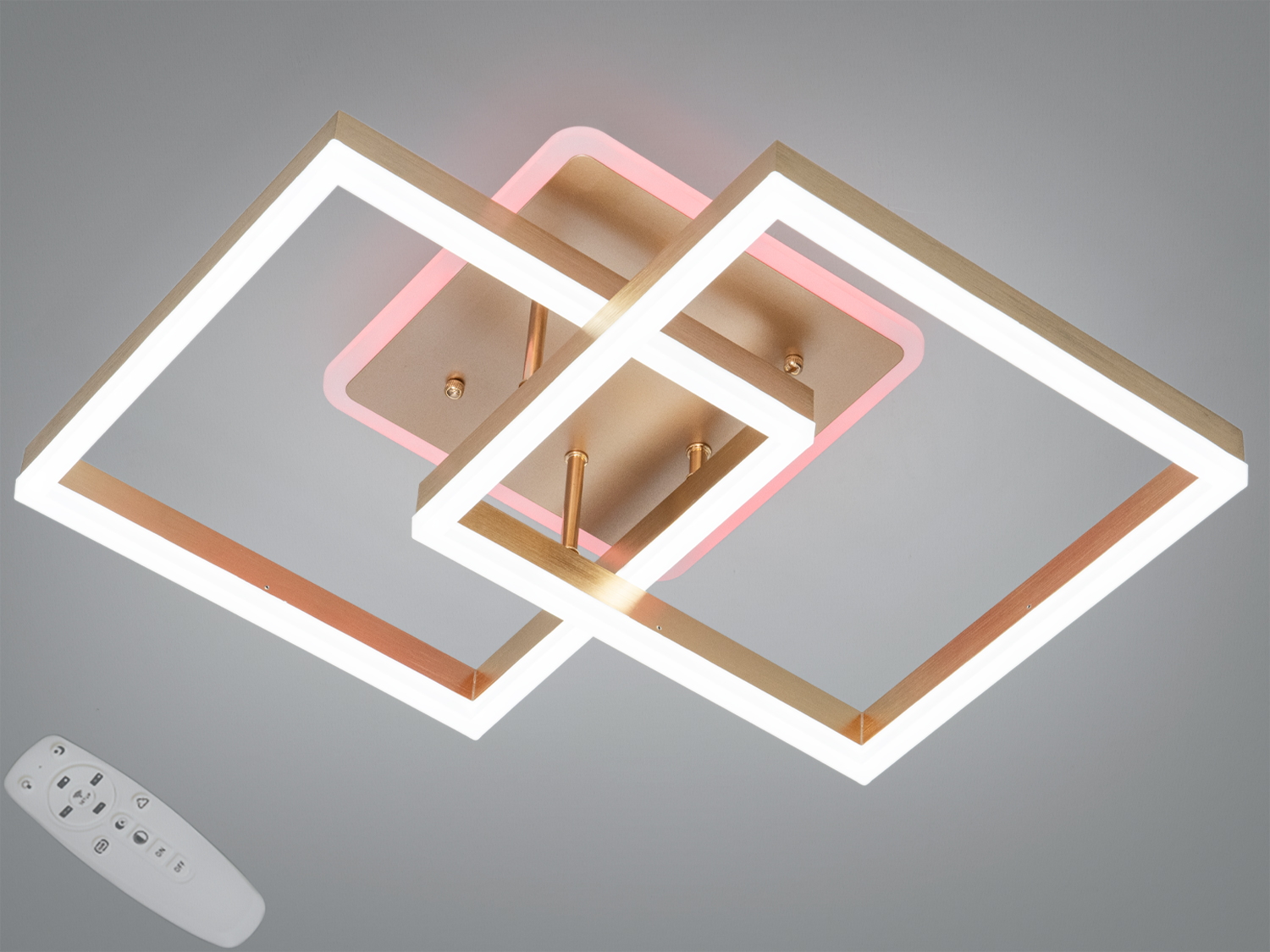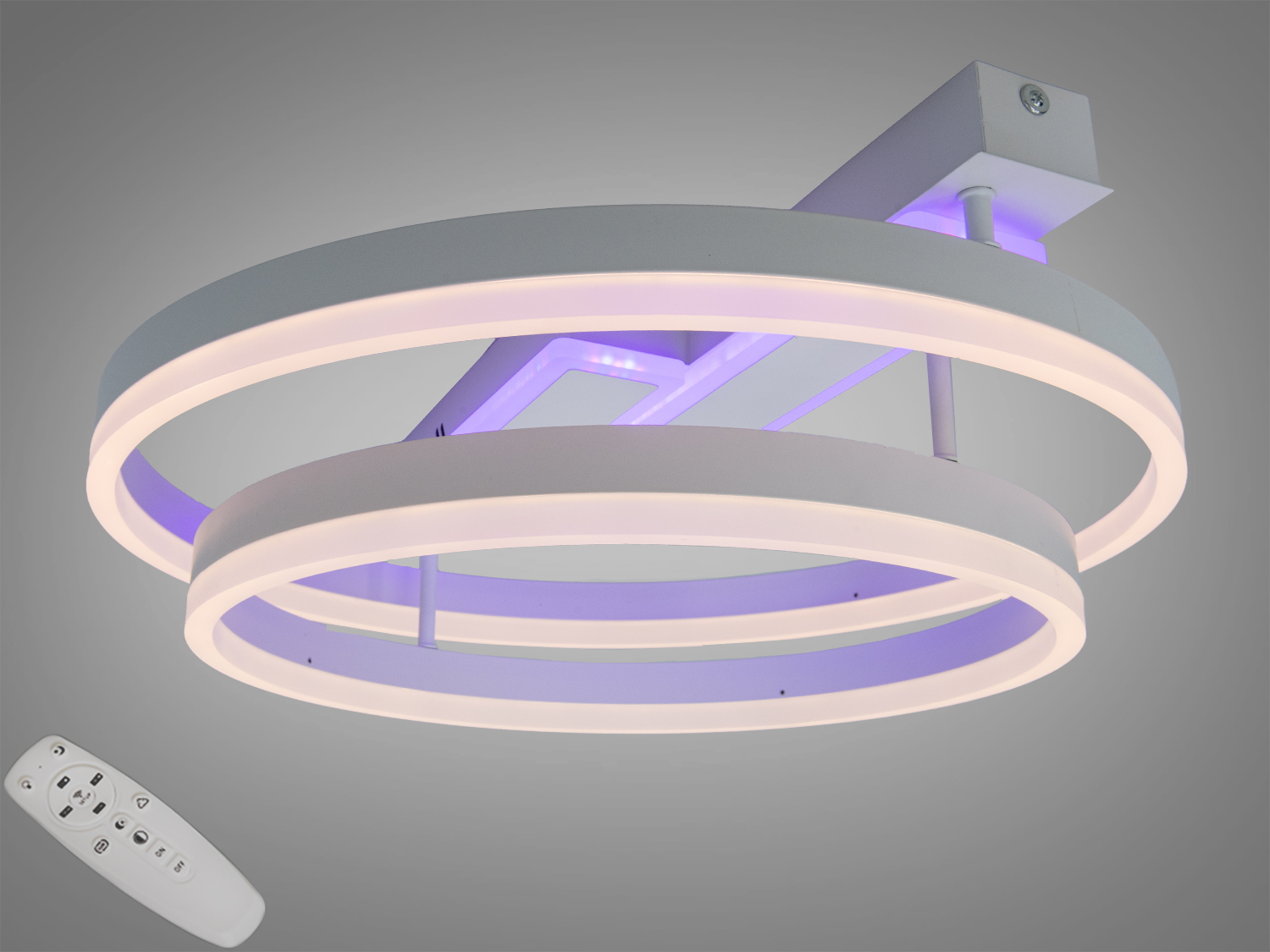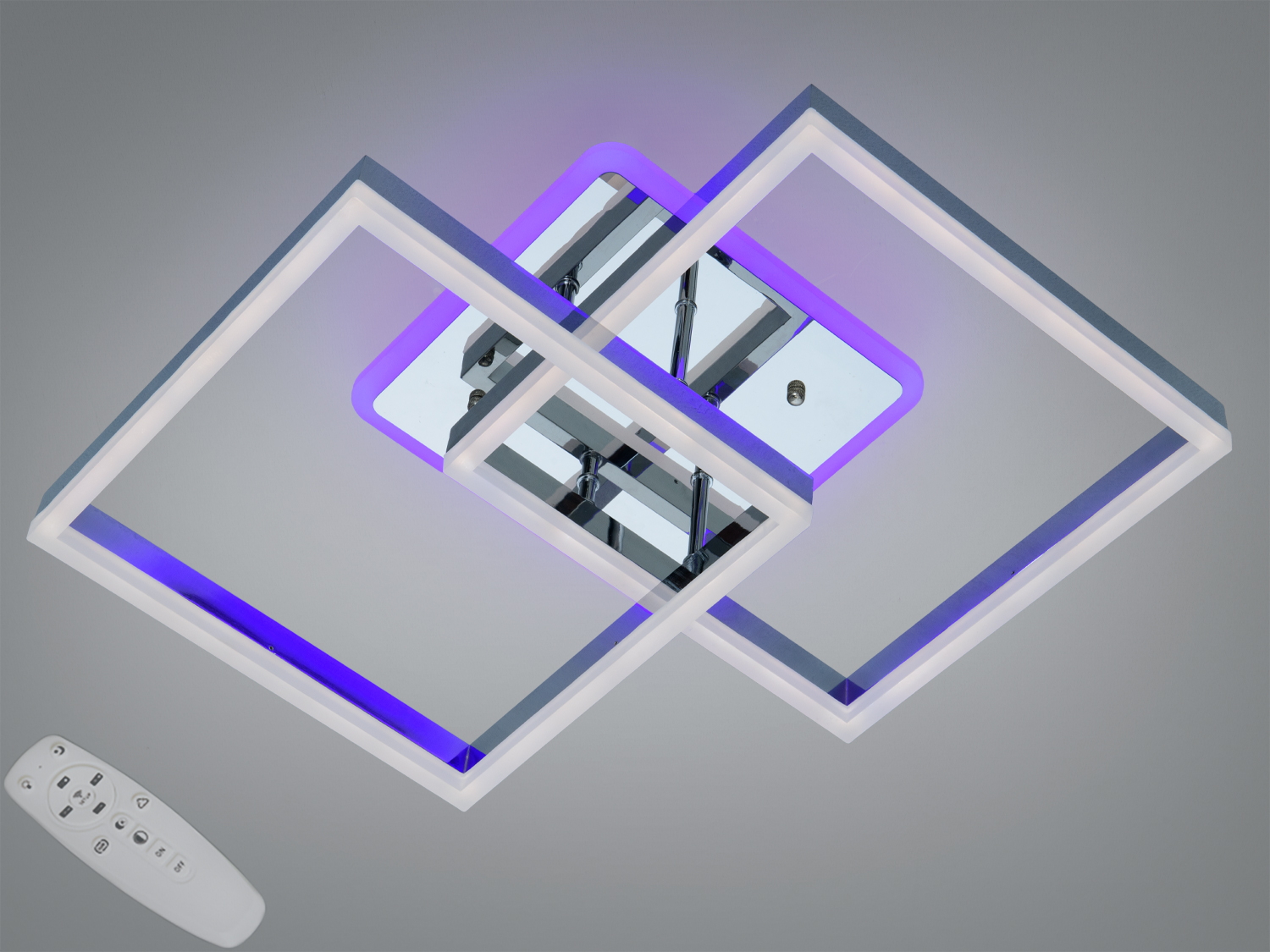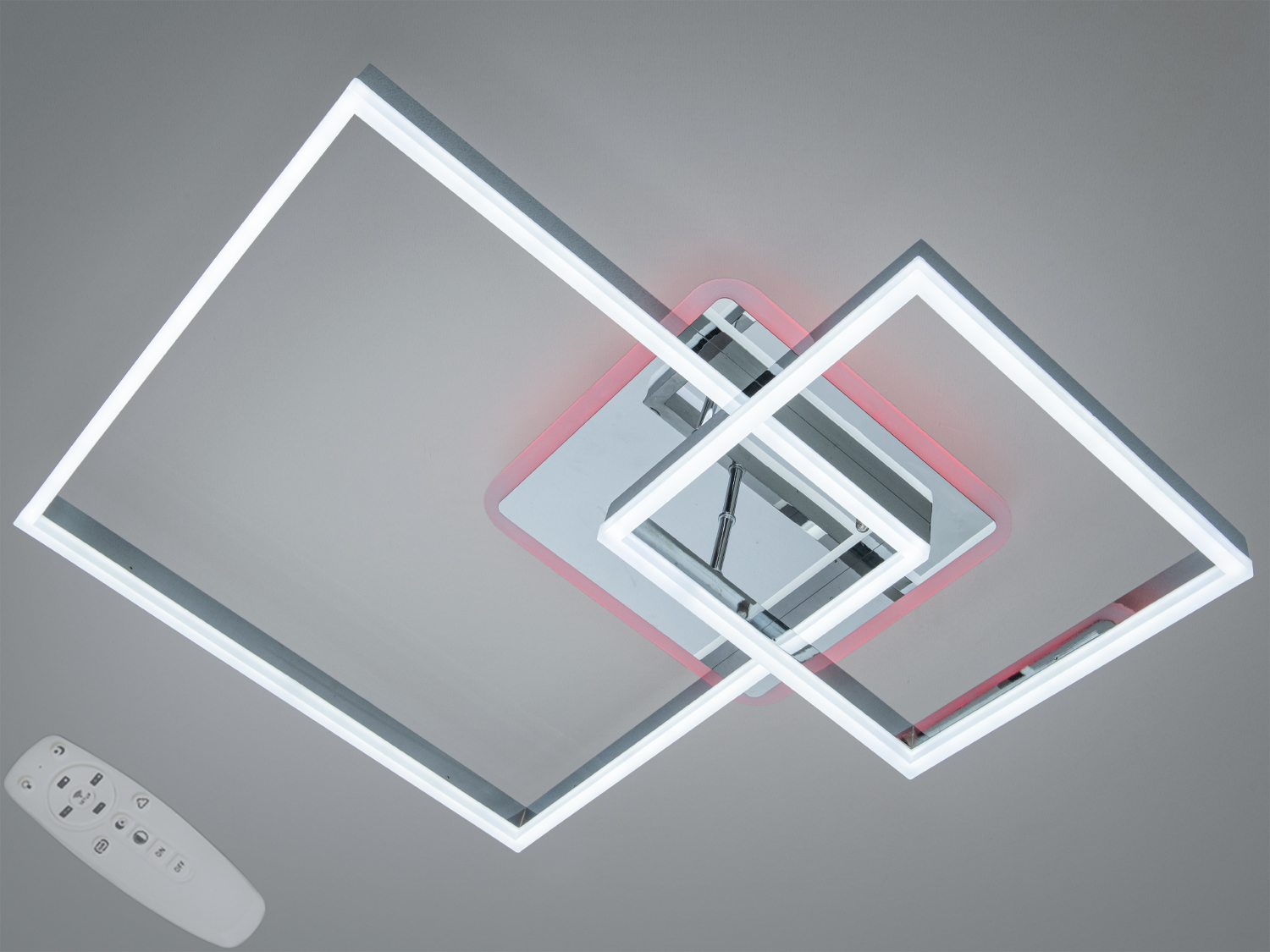Стельова LED люстра в матовому хромі, 84 Вт — це накладний квадратний світильник із пультом керування, який пропонує яскраве базове світло та зручні сценарії для щоденного користування. Сумарний світловий потік 4620 лм зазвичай достатній для кімнат до 15 м² (фактичне покриття залежить від висоти стелі, світлості стін і планування). Два акрилові світлові модулі забезпечують м’яке рівномірне освітлення без різких контрастів, а низький профіль зберігає корисну висоту приміщення.