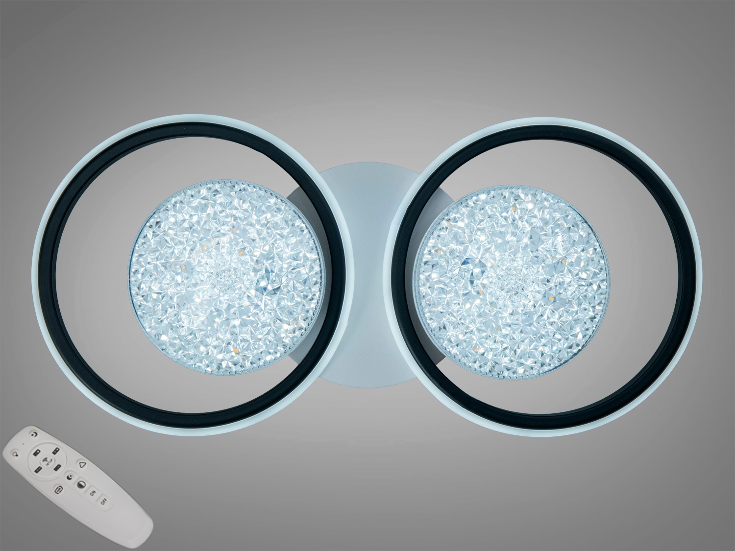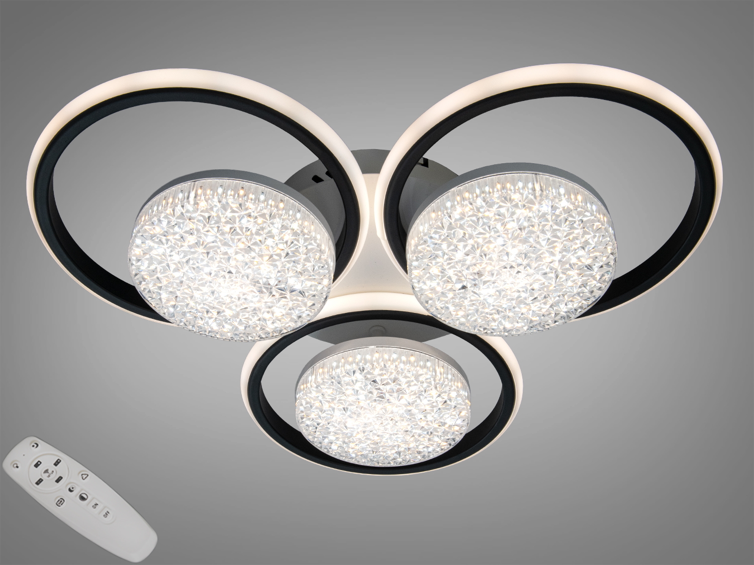 Що важливо знати: світильник встановлюється на стандартну стельову поверхню, інтегровані LED-модулі не потребують окремої заміни ламп. Поєднання білого та чорного дозволяє вписати модель у скандинавські, мінімалістичні та hi-tech інтерʼєри. Димер та пульт роблять керування гнучким: користувач може налаштовувати освітлення під різні сценарії протягом дня.