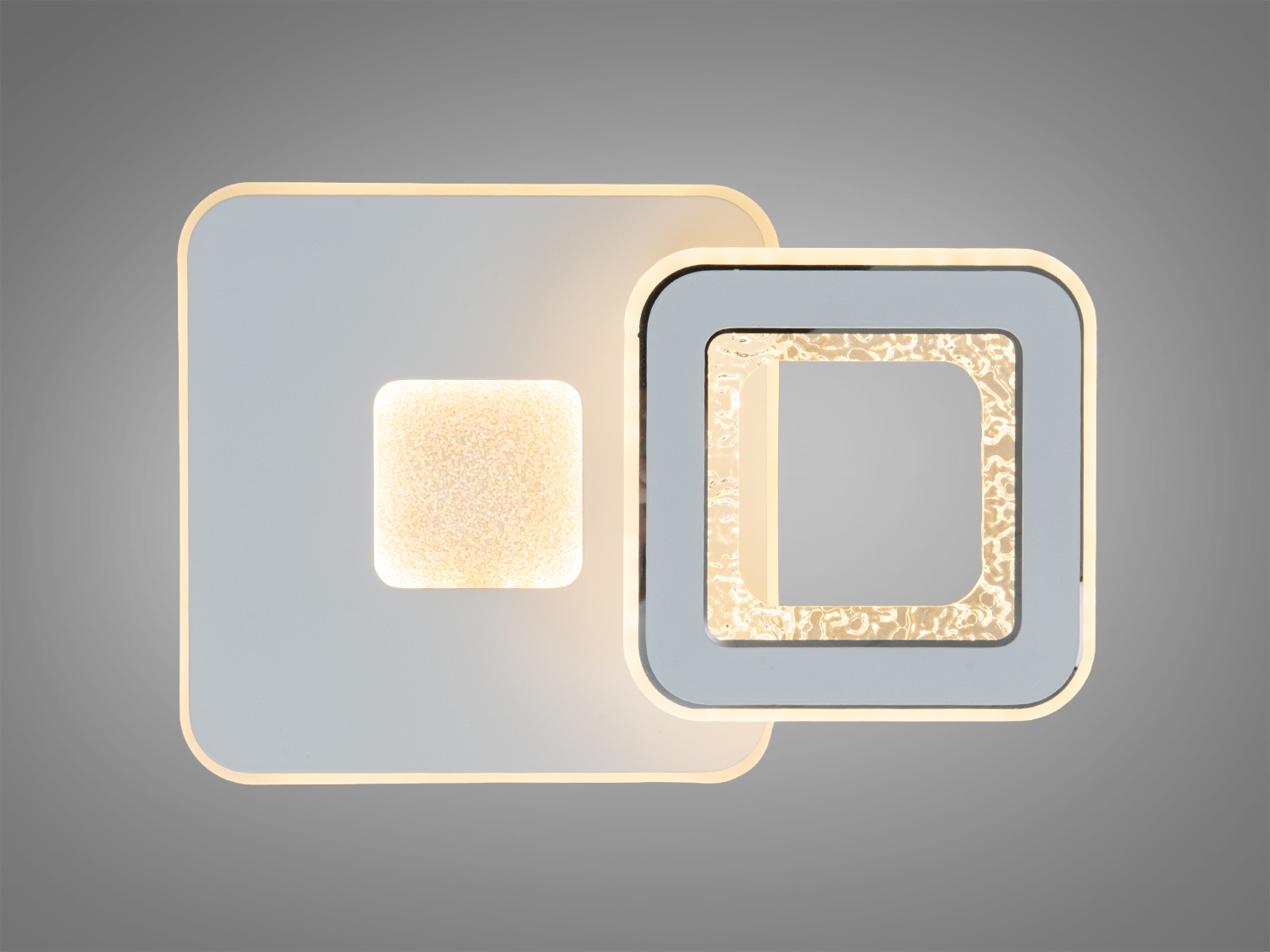 Модель поєднує два візуальні елементи: основний круглий диск та внутрішню декоративну частину з хвилястою текстурою. По колу розташована прозора акрилова окантовка, що підкреслює світловий контур і додає об’єму, зберігаючи мінімалістичний вигляд. Білий колір корпусу робить світильник непомітним у вимкненому стані та доречним у сучасних інтер’єрах. Матовий розсіювач згладжує світловий потік для приємного зорового сприйняття.