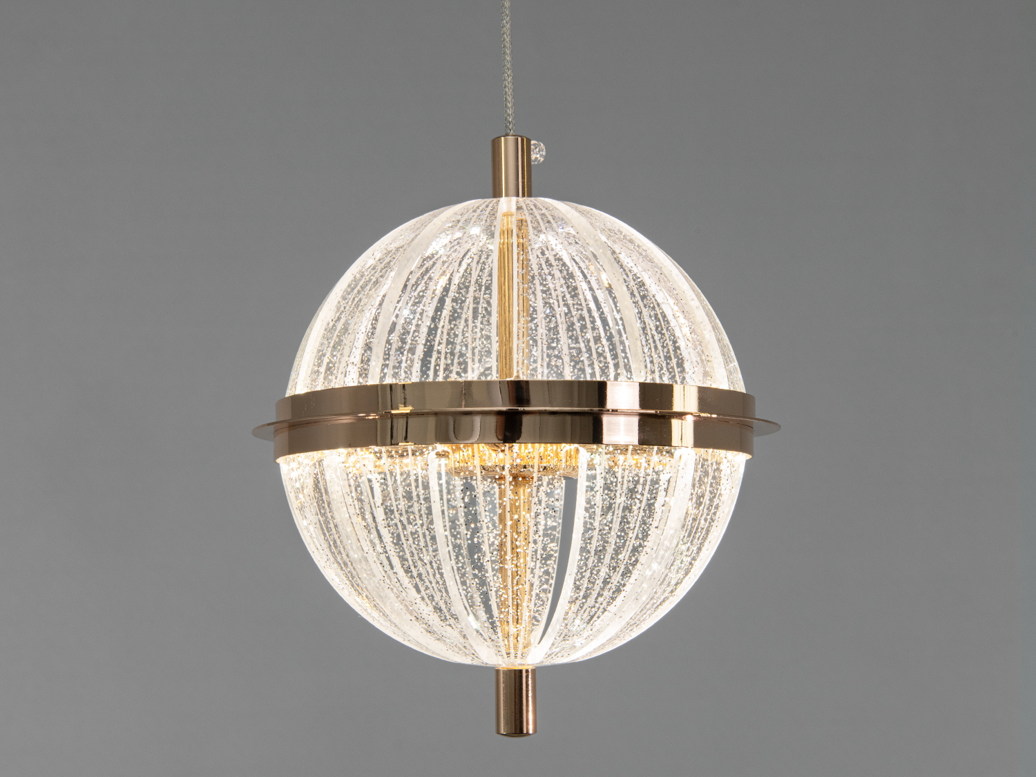 Світильник має сферичний плафон із прозорого акрилу, який працює як рівномірний розсіювач і підсилює відчуття об’єму завдяки блиску поверхні. Хромований металевий каркас підкреслює сучасний характер моделі та легко поєднується з фурнітурою у ванільно-сріблястій гамі: змішувачами, ручками меблів, технікою. Довгий підвіс із регулюванням допомагає розмістити світильник на зручній висоті — як у кімнатах зі стандартною стелею, так і в приміщеннях із високими перекриттями. За бажання можна встановити кілька підвісів у ряд для підсвічування стільниці або барної зони.