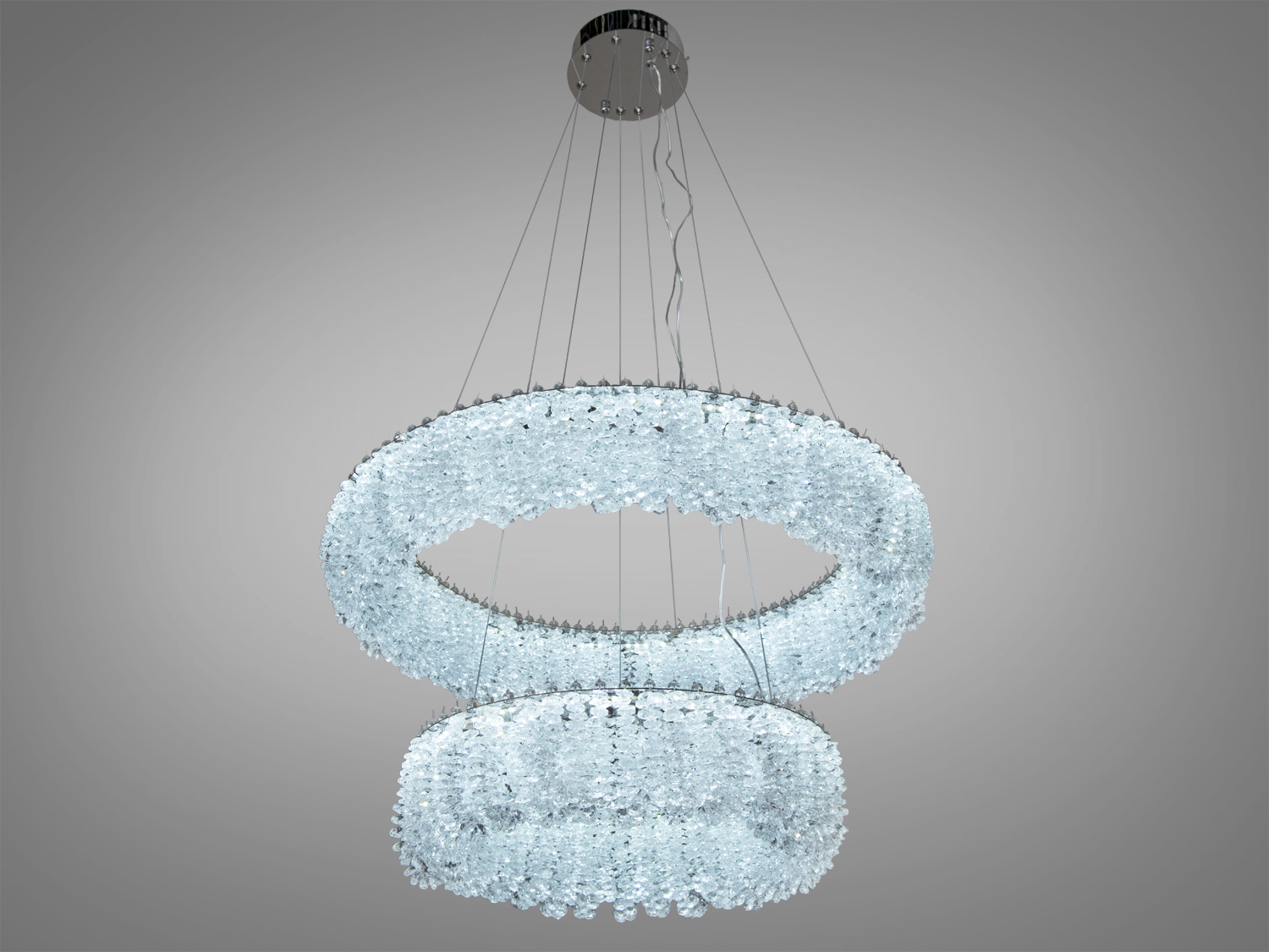 Люстра виготовлена з високоякісного хрому і прозорого кришталю, що створюють вражаючий ефект блиску. Її дві кільцеві конструкції прикрашені кришталевими підвісками, які віддзеркалюють і розсіюють світло по всій кімнаті, створюючи атмосферу тепла і затишку.