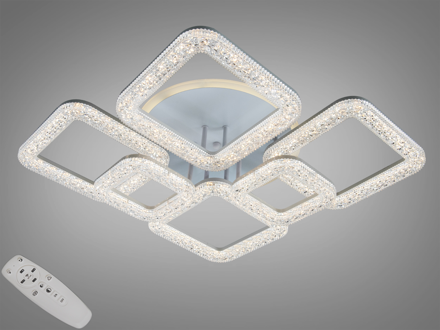 Візуальний центр моделі — квадратні рамки, які можна сприймати як розташовані під кутом «діаманти». Прозорі вставки по периметру підкреслюють світловий візерунок і створюють приємний «кристальний» ефект без зайвого блиску. Білий колір корпусу легко поєднується зі світлими стелями та допомагає зберігати відчуття простору навіть у компактних кімнатах.