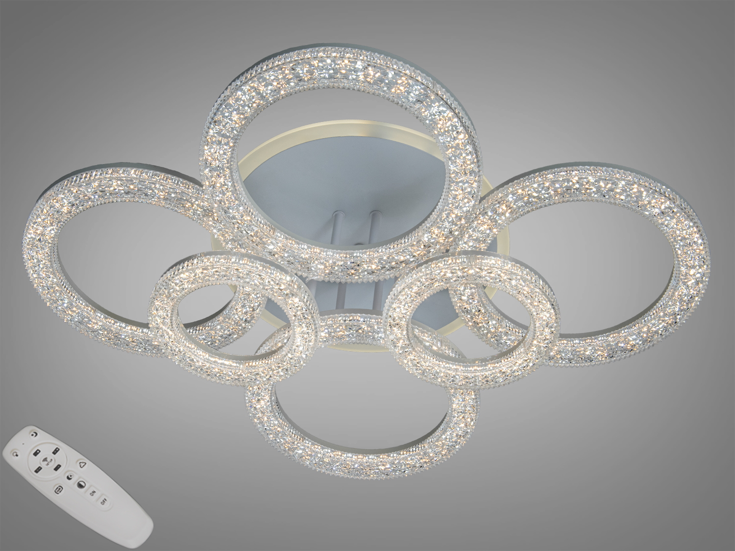 Це стельовий LED-світильник з чотирма кільцями, інкрустованими кристалами, який передбачає рівномірне загальне освітлення та ефектні відблиски на поверхнях. Завдяки потужності 72 W модель може забезпечувати комфортний рівень світла в кімнатах площею близько 12 м². Корпус виконано в чорному кольорі, що візуально підкреслює геометрію кілець і поєднується з сучасними інтер’єрами. Керування здійснюється з пульта — зручно змінювати яскравість і вмикати світло, не підходячи до вимикача.