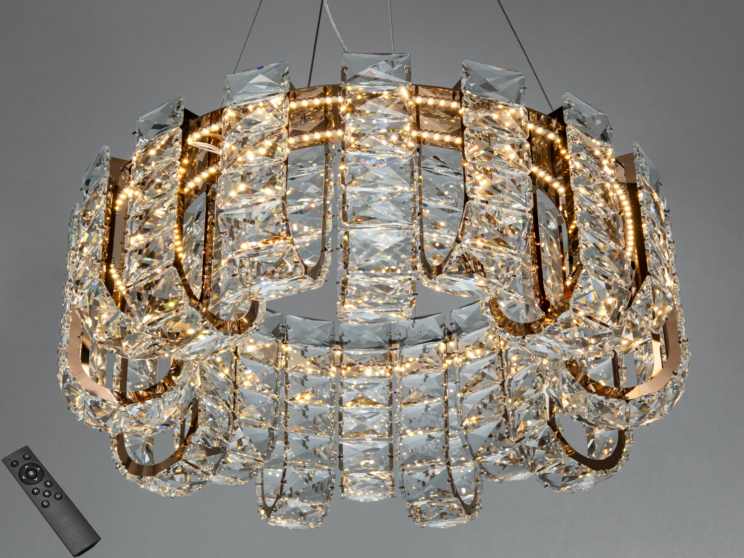 - Золоте оздоблення — металевий корпус у теплій глянцевій/сатиновій золотій тональності підкреслює кришталеві грані та додає інтер’єру відчуття тепла.