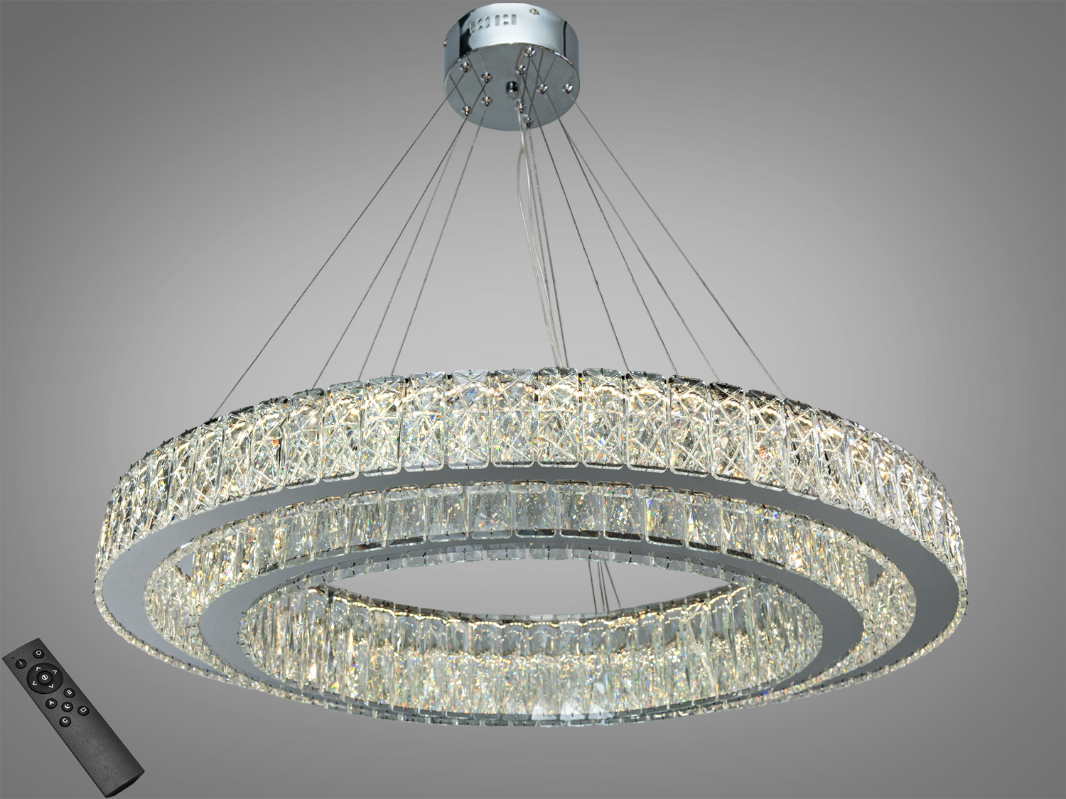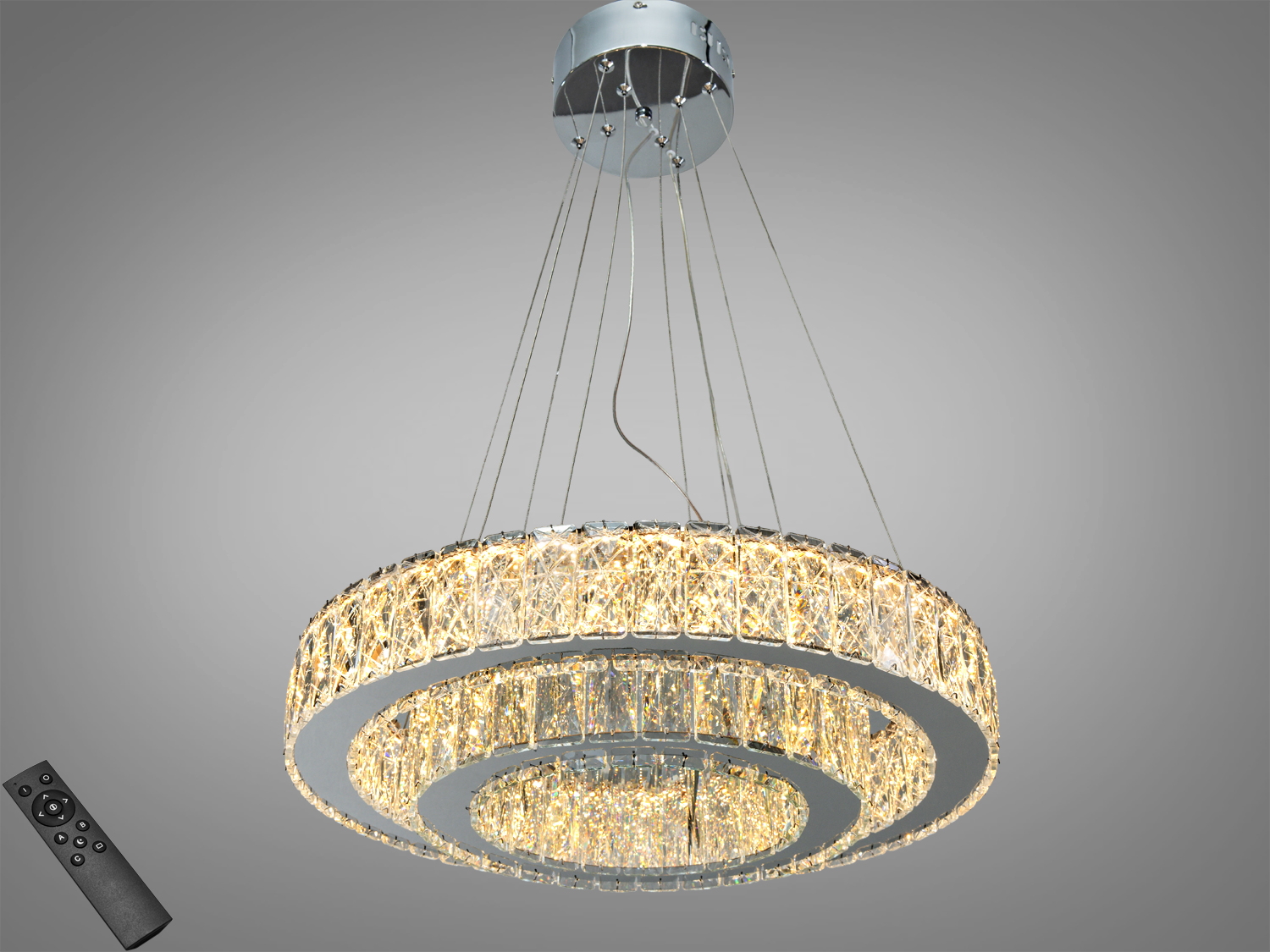 Ця підвісна кришталева LED люстра поєднує декоративний потенціал двох овальних рівнів та практичність керування пультом. Три колірні температури допомагають адаптувати світлову сцену під різні сценарії, а світлового потоку вистачає для кімнат орієнтовно до 15 м². Якщо потрібен інший відтінок фурнітури, у серії зустрічається варіант у хромі.