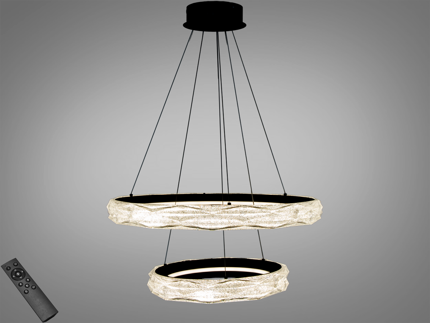 Підвісна світлодіодна люстра з двома кільцями у золотому кольорі поєднує вражаючий дизайн і практичну потужність. Кільця з прозорою, текстурованою поверхнею створюють ефект льоду та м’яко розсіюють світло. Модель укомплектована пультом дистанційного керування, що спрощує щоденне використання. Потужність 152 Вт доцільно розрахована для освітлення площі до 26 м², тому люстра підходить для вітальні, їдальні чи спальні середнього розміру.