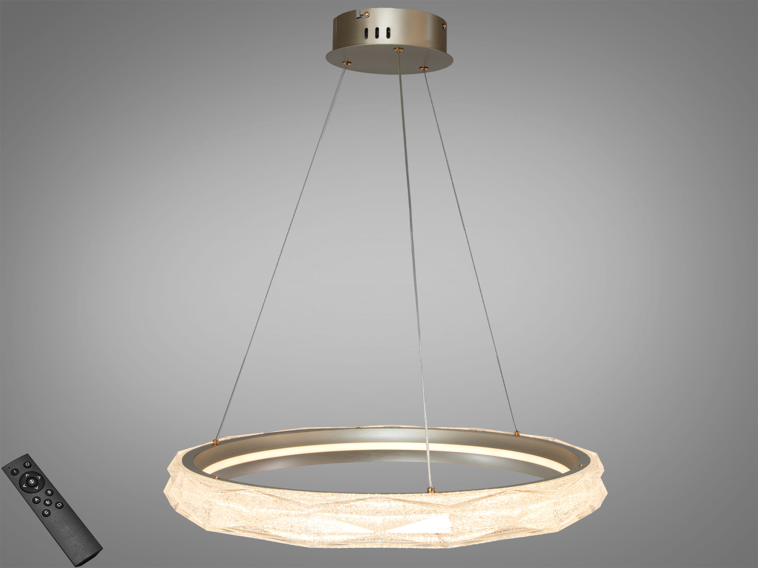 Підвісна світлодіодна люстра з пультом 152 Вт у золотому кольорі може стати концентратором освітлення для кімнат до 26 м². Текстуровані прозорі кільця з «льодовим» ефектом формують впізнавану геометрію та комфортне світло, а дистанційне керування спрощує щоденне використання.