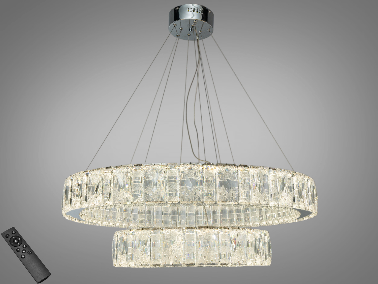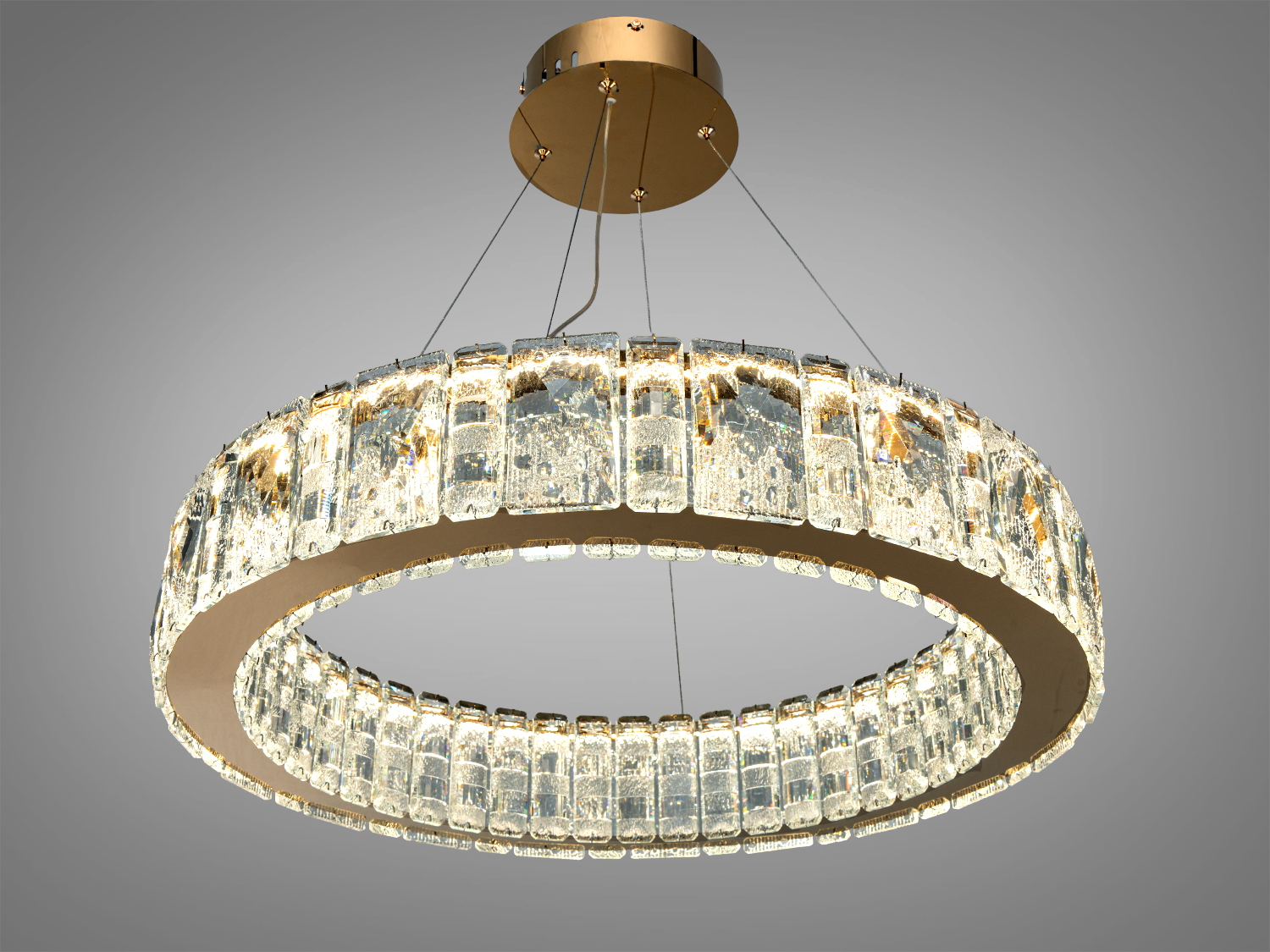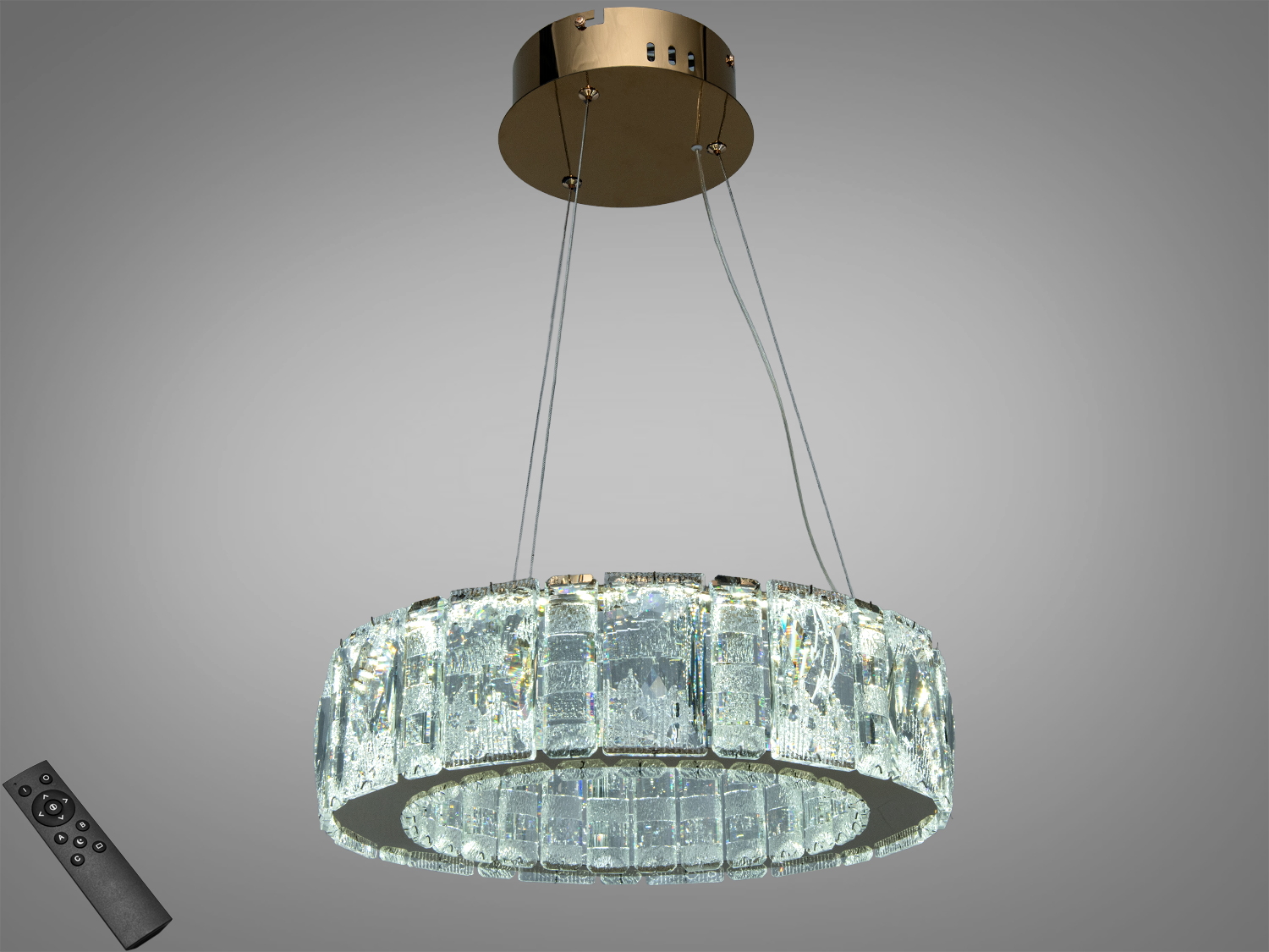 Модель має підвісну конструкцію на тросах та круглий контур, що органічно виглядає в просторах від класики до contemporary. Прозорі кришталеві вставки формують багатогранні відблиски та забезпечують рівномірне розсіювання світла по периметру. Основа виконана з металу у відтінку золото, що пасує як до теплих, так і до контрастних палітр оздоблення. У лінійці також зустрічається варіант у хромі, якщо потрібен більш холодний металевий акцент. Підвішування на тросах допомагає акуратно розмістити люстру по центру кімнати; під час монтажу довжину підвісів зазвичай коригують під висоту стелі.