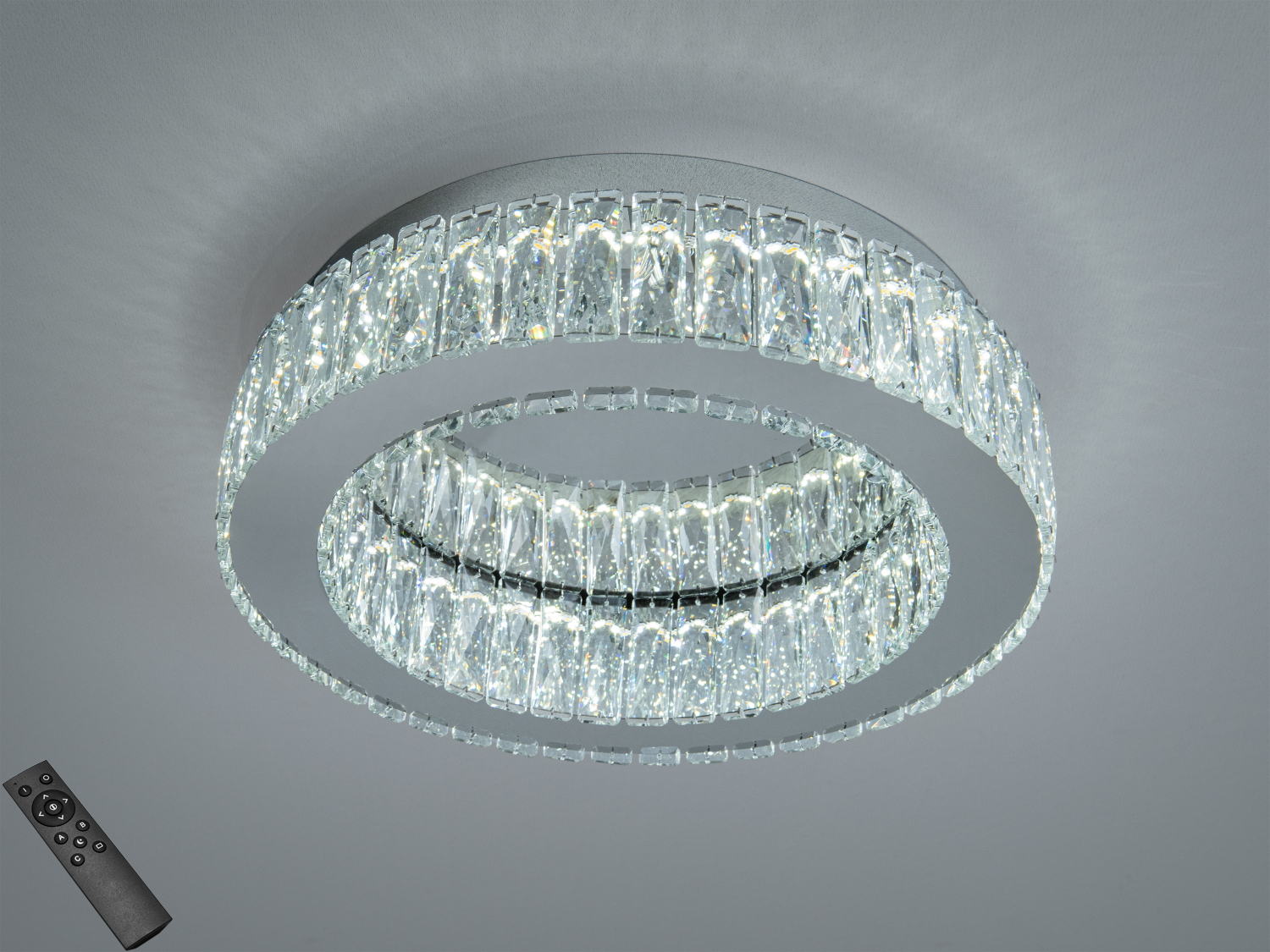 Стельова кришталева LED люстра Diasha у хромованому виконанні поєднує сучасну світлодіодну технологію та класичний блиск кришталю. Модель розрахована на 70 Вт потужності, монтується впритул до стелі та керується пультом дистанційного керування для максимальної зручності у щоденному використанні. Такий формат освітлення часто обирають для основного світла у житлових просторах, де важлива чиста геометрія стелі, відсутність громіздких підвісів і виразна гра відбиттів на кришталевих гранях.