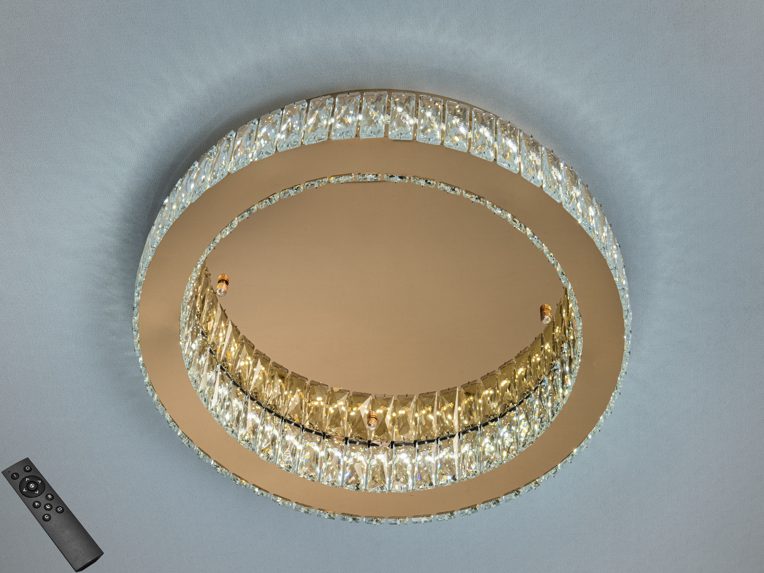 Вбудований LED-модуль 70 Вт забезпечує рівномірне загальне освітлення, а пульт допомагає керувати світильником на відстані — це зручно, коли вимикач розташований не під рукою або потрібне швидке перемикання між доступними режимами. Світлодіодне рішення передбачає нижчі витрати електроенергії порівняно з лампами розжарювання, а також довший ресурс роботи без частих замін.
