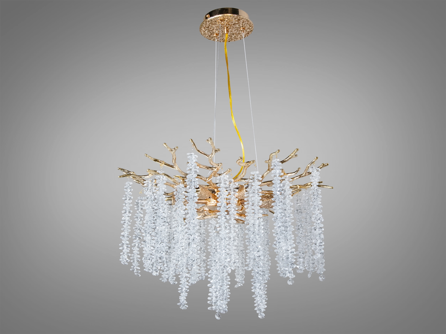 Чарівна підвісна кришталева люстра "Гліцинія" від ТМ "Діаша" — це справжній витвір мистецтва, що поєднує сучасний дизайн та витончений стиль. Ця люстра на шість ламп з патроном G9 виконана в хромованому кольорі, що додає їй елегантності та блиску. Центральний каркас люстри має форму розгалужених гілок, які ніби зіткані з металу і створюють відчуття природної краси. Кожна гілочка прикрашена кришталевими підвісками, що імітують витончені грона гліцинії, які виблискують під будь-яким кутом огляду, створюючи ефект мерехтливого сяйва.
