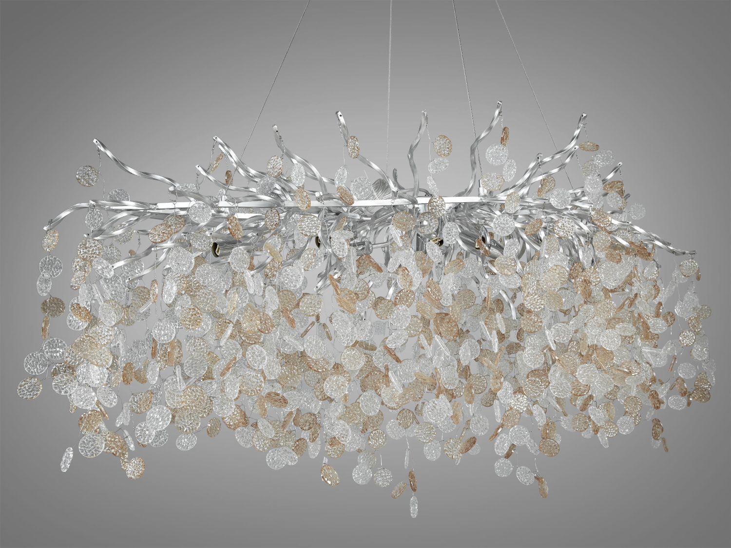 Ця підвісна люстра Diasha поєднує витягнуту композицію та прозорі скляно-кришталеві елементи, що нагадують листя й краплі роси. Хромована металева основа підкреслює чистоту форм і дозволяє отримати дзеркальні відблиски, які, залежно від типу встановлених ламп, можуть наповнювати простір м’яким або більш виразним сяйвом. Модель створена як акцент для інтер’єрів у класичному та сучасному класичному стилі, а також доречно виглядає у святкових сценаріях декору.
