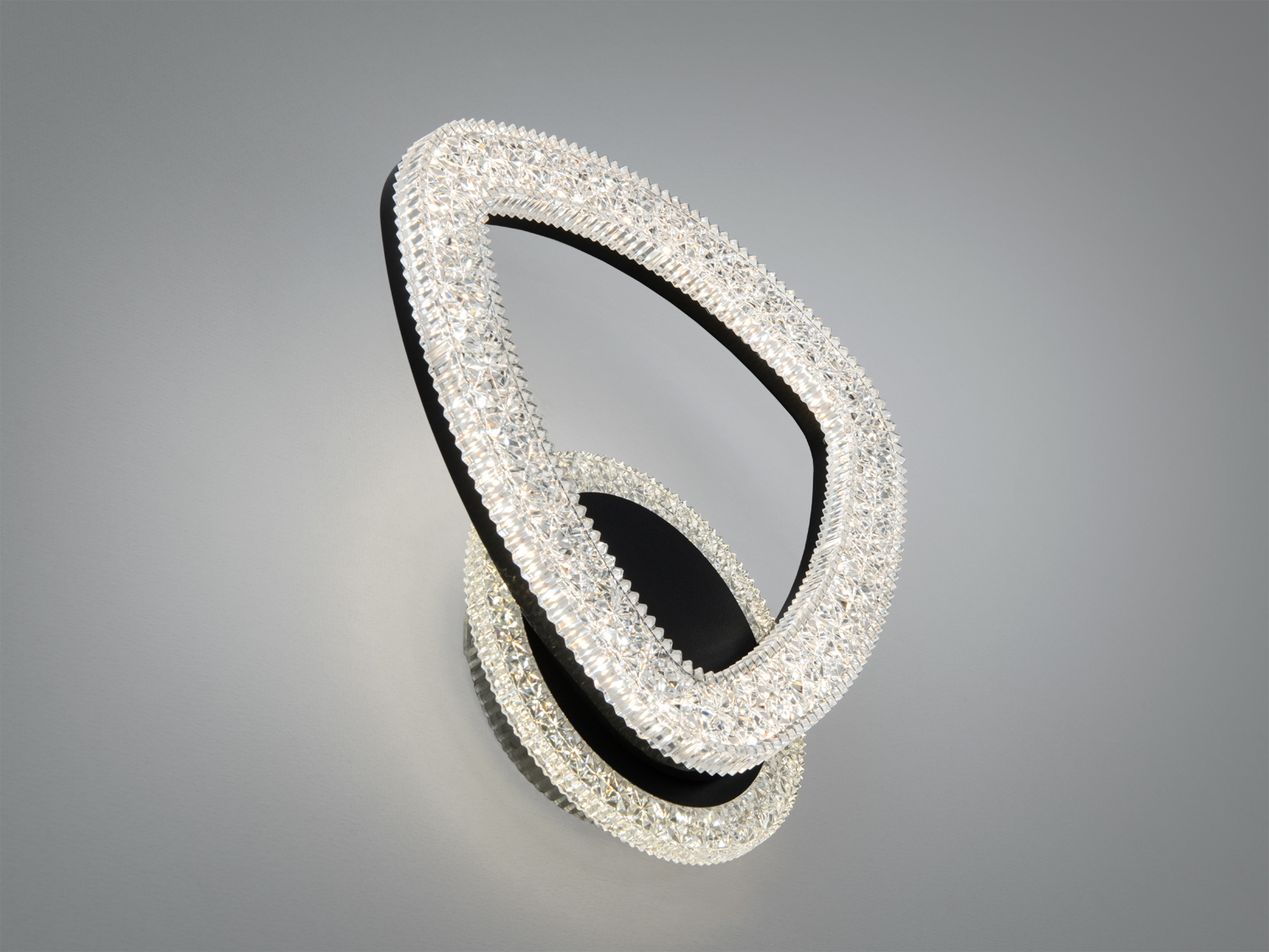 Конструкція створена на основі металевої платформи з чорною обробкою та акрилових розсіювачів. Декоративні кристалічні елементи додають приємного іскоріння у відбитому світлі, не перевантажуючи інтер’єр. Завдяки пласкому монтажу люстра органічно виглядає у кімнатах із стандартною висотою стель і вписується в сучасні та мінімалістичні інтер’єри.