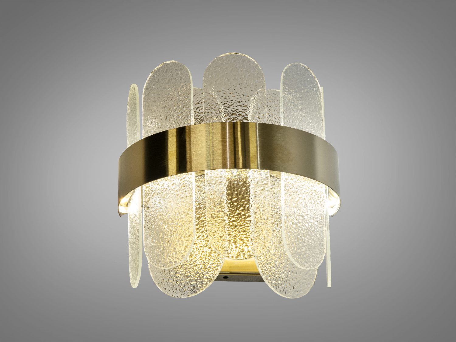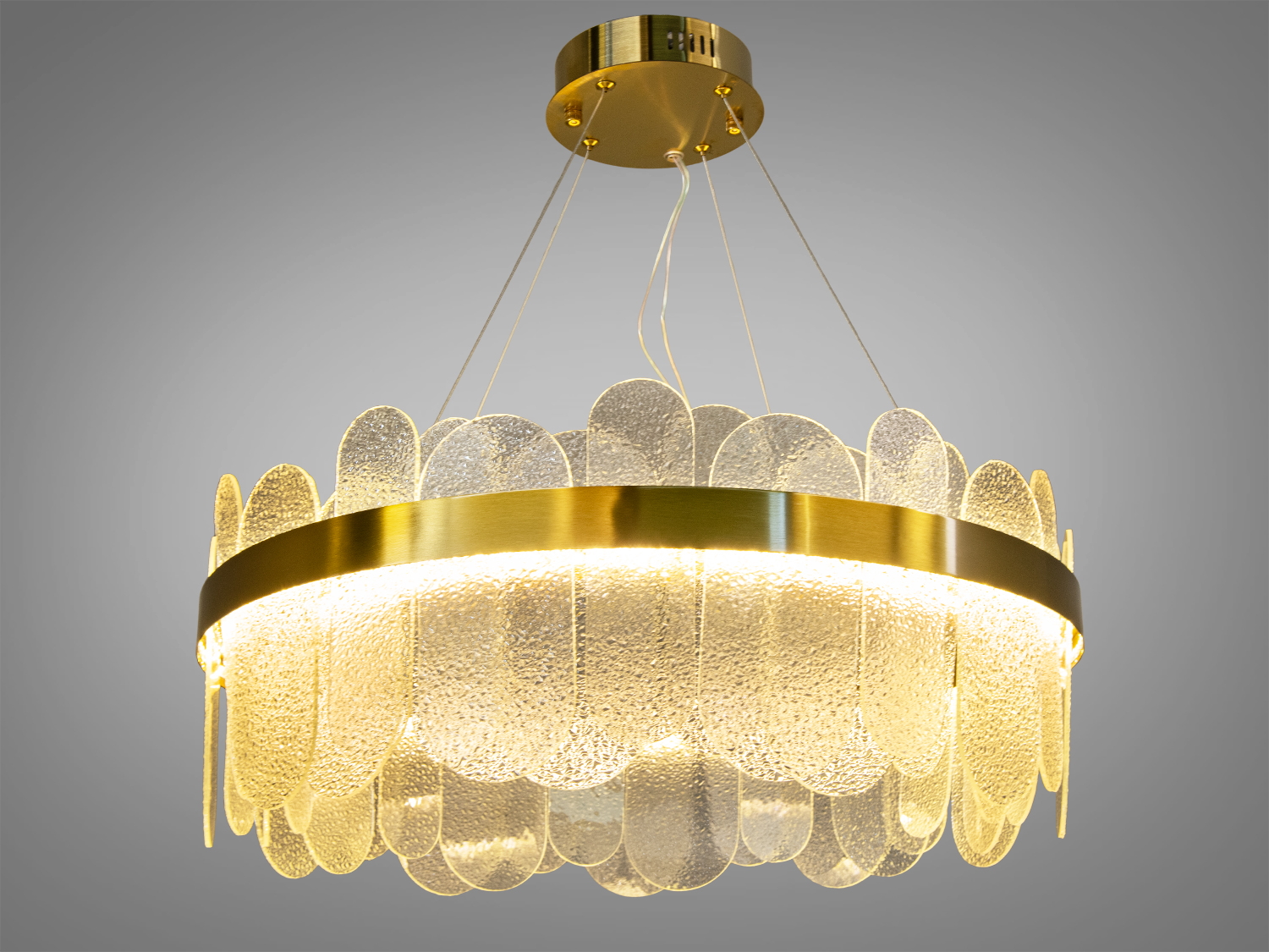 Люстра має круглу форму з елегантним золотистим ободком, що надає їй класичної чарівності. Прозорі кришталеві підвіски подібні до льодяників, вони не лише прикрашають виріб, але й створюють чарівний блиск, осяюючи інтер′єр своїм сяйвом.