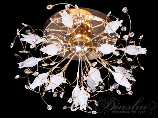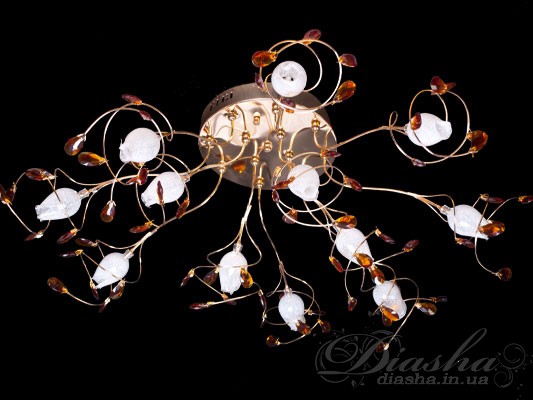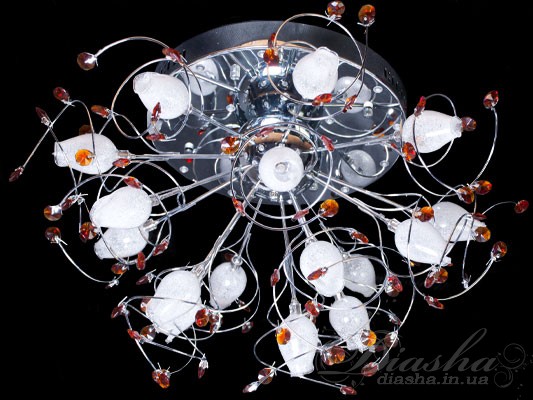 Немов букет екзотичних квітів - таке враження справляє ця галогенова люстра. За Вашим побажанням, вона може комплектуватися прозорими, рожевими, коричневими і зеленими каменями.