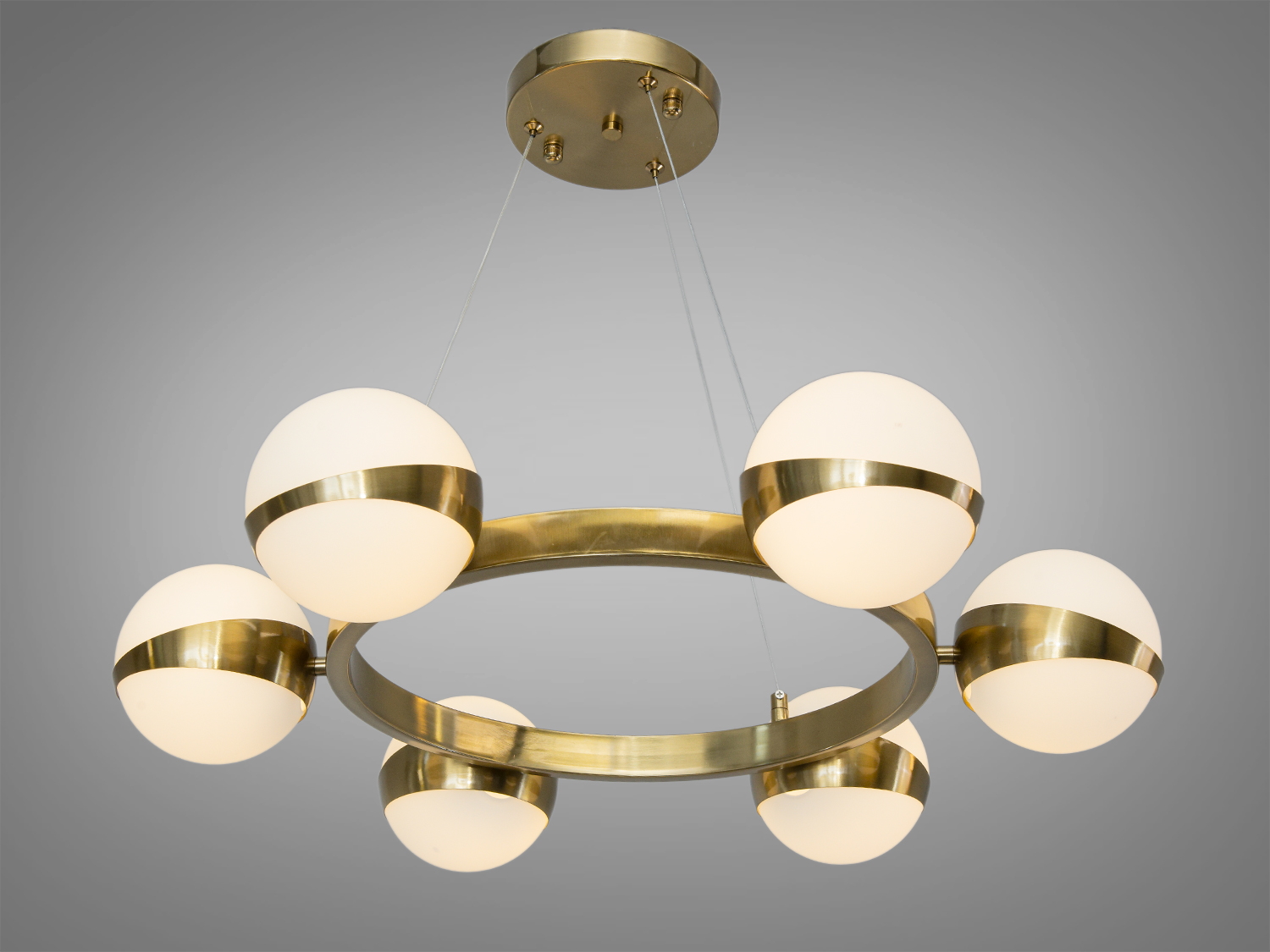 Одним із ключових елементів дизайну є скляні плафони білого матового кольору, що нагадують бульбашки. Ці плафони виконані у різних розмірах і кріпляться асиметрично, що надає люстрі унікальності та характеру. Різні розміри бульбашок створюють неповторний інтер′єрний акцент.