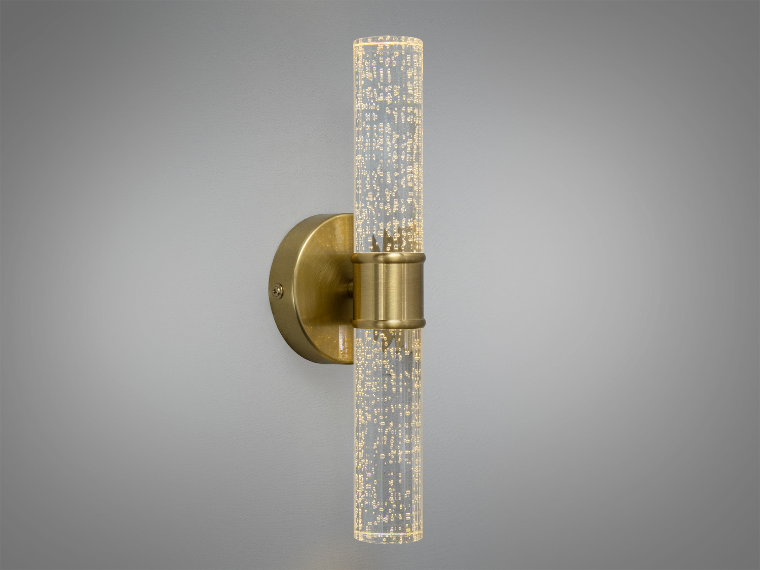 Настінний світильник з прозорим циліндричним плафоном, що містить бульбашки. Чорна основа для вертикального монтажу. Ідеально для сучасного інтер′єру.Світильник з прозорим циліндричним плафоном, прикрашеним бульбашками. Металева основа підходить для ванної кімнати. Вертикальний монтаж.Вертикальний настінний світильник з циліндричним плафоном і бульбашками всередині. Чорна кругла основа. Підходить для коридорів.