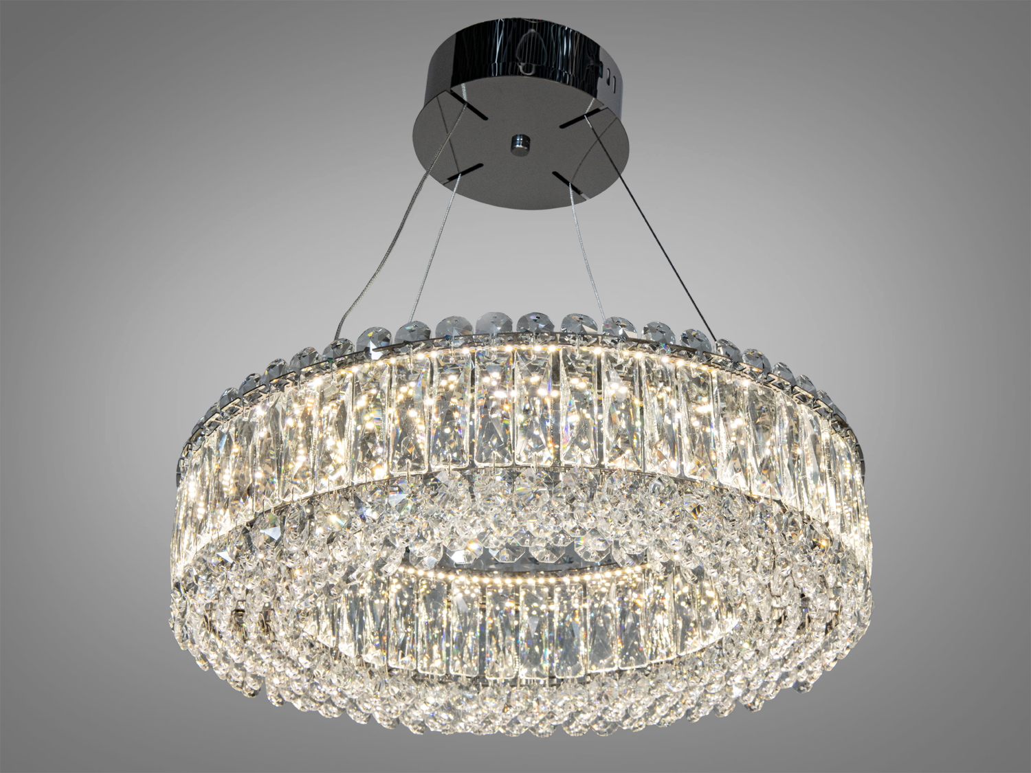 Підвісна кругла кришталева люстра у хромі поєднує прозорі кришталеві підвіси та вбудоване LED-світло. Модель створює рівномірне базове освітлення з світловим потоком близько 3025 лм при споживанні 55 Вт і пропонує три температури світла: 3200К, 4100К, 6500К. Перемикання режимів передбачене через настінний вимикач. Такої яскравості зазвичай достатньо для кімнати площею до ≈10 м² за умови стандартної висоти стелі.