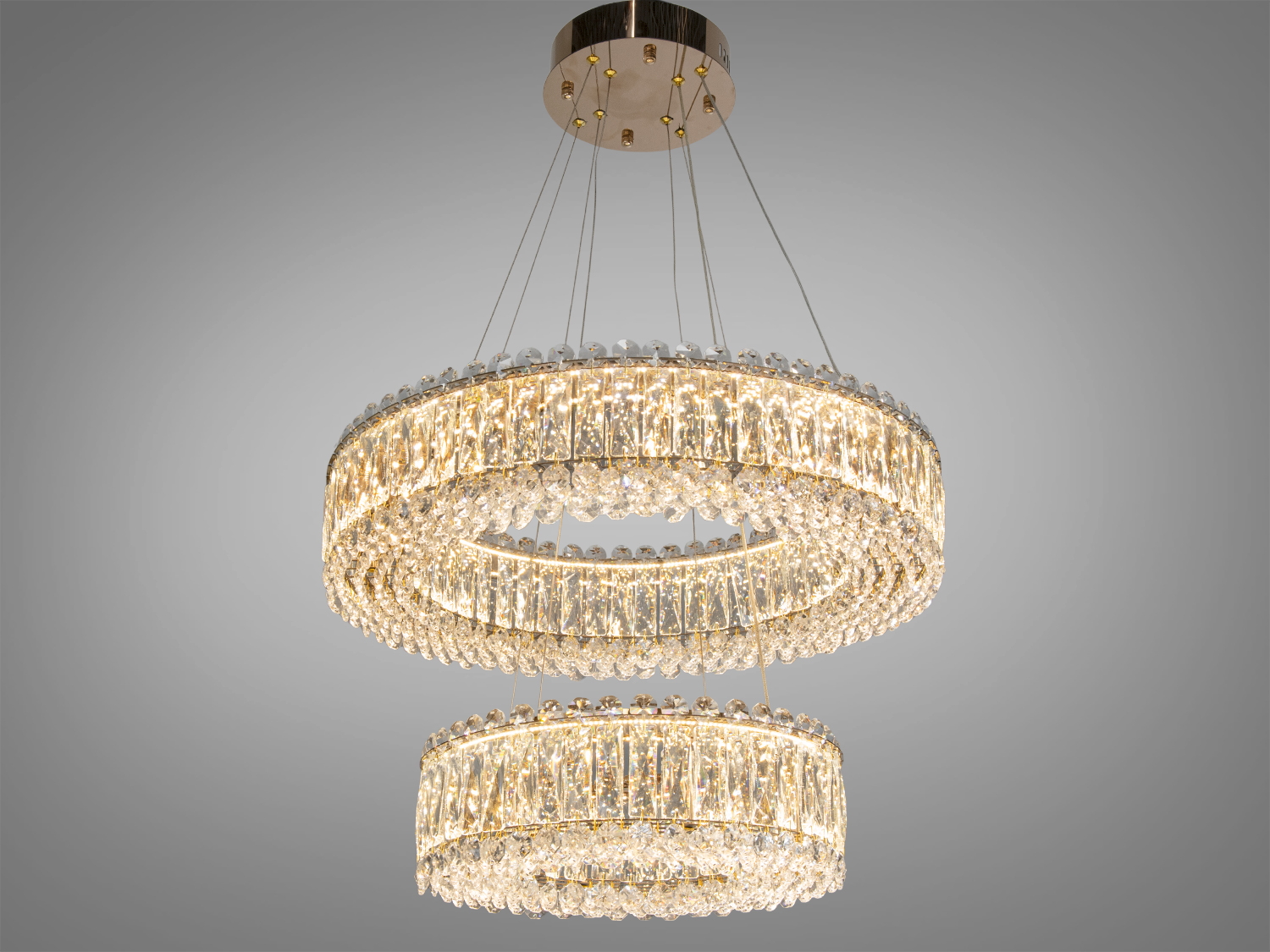 Конструкція має круглий металевий каркас з хромованим покриттям і підвіски з прозорих кришталевих елементів. Світло, проходячи крізь грані кришталю, підсилює відблиски та створює виразні переливи без надмірного засліплення. Підвіска реалізована на тросах, що формує «легку» підвішеність і візуально розвантажує простір.