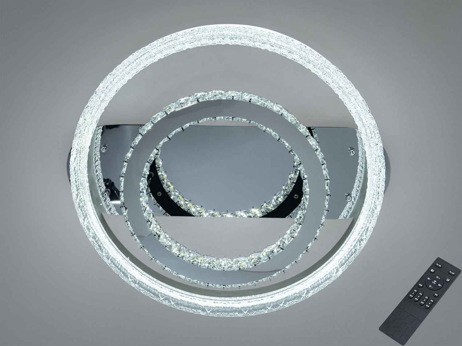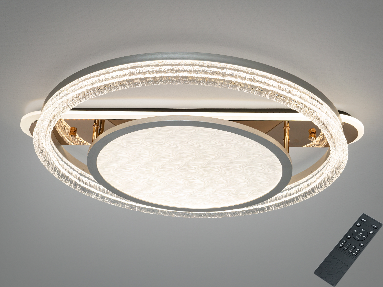 - Три акрилові кільця, змонтовані одне в одному: середнє кільце з кришталевими вставками додає іскор відбитого світла, а найбільше кільце з текстурованим акрилом пом’якшує світловий потік.