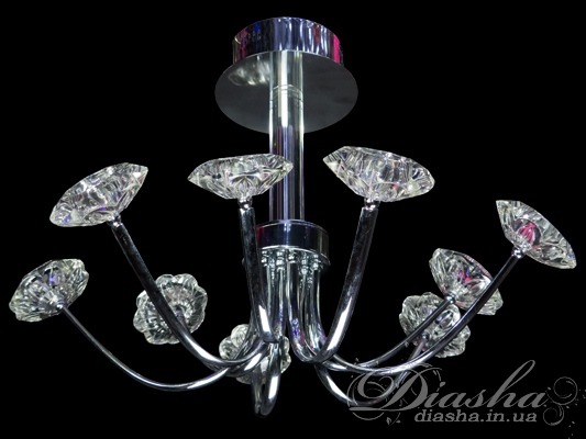 Стебла люстри вигнуті з елегантністю та легкістю, ніби граційні танцюристи, замерзлі в па. Вони випромінюють благородство хрому, що сяє як дзеркало, в якому відбивається балет світлових ігор. Кожен кришталевий елемент люстри здається оживленим, наче він має власну історію, яку розповідає мовою блискіток та відблисків.