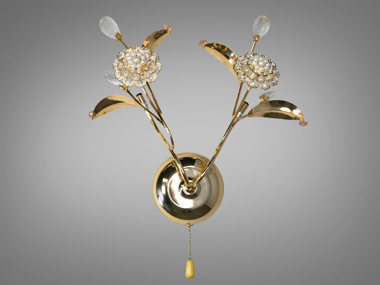 Ця модель бра оживляє стіни, перетворюючи їх у полотно для ніжного букету з квітів, які здаються наче вирощені зі світла. Золотисті стебла граційно вигинаються, тримаючи на собі блискучі кристали, що імітують квіткові бутони та пелюстки. Дизайн з елементами кристалів додає світильнику привабливого блиску та ефекту розсіювання світла, яке створює неповторну атмосферу у просторі.