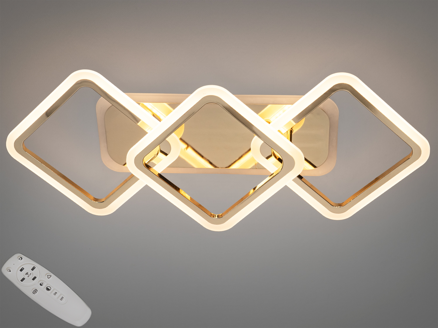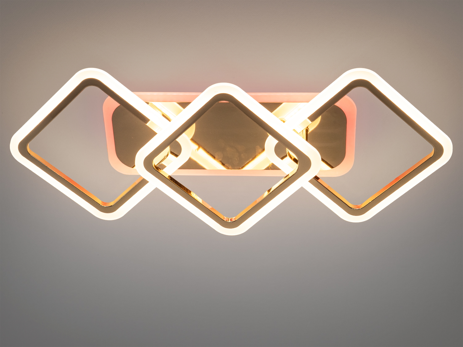Деталі зовнішнього вигляду. З першого погляду ця гармонійна світлодіодна люстра вражає своєю витонченістю та лаконічністю. Її конструкція базується на трьох ромбоподібних елементах, які створюють гармонійну композицію. Багатий золотий колір металевої основи додає легкості та універсальності, завдяки чому акрилова люстра виглядає свіжо й ненав’язливо. Зовнішні розсіювачі, виготовлені з високоякісного акрилу, забезпечують рівномірне світло, створюючи приємну атмосферу в кімнаті. Ледь помітне підсвічування прямокутної пристельової основи змінює відтінки залежно від налаштувань і додає динаміки. Це лед підсвічування може змінювати кольори, підкреслюючи сучасний стиль лед люстри та додаючи нотку технологічності.