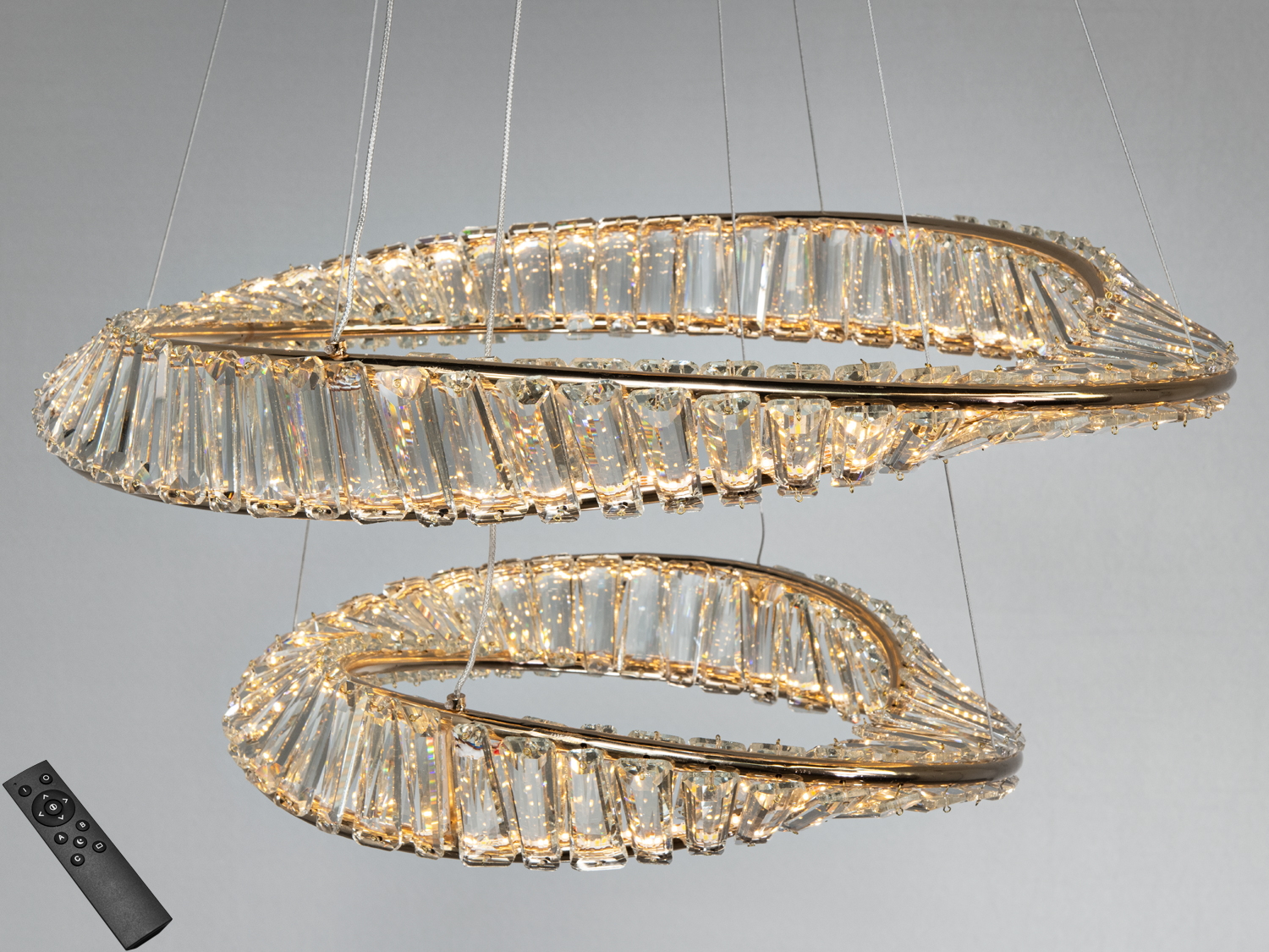 Ця кришталева підвісна люстра з двома кільцями пропонує сучасний підхід до освітлення віталень, спалень і їдалень. Дизайн з елементами у формі стрічки Мебіуса створює враження безперервного світлового контуру, а пульт дистанційного керування дозволяє змінювати яскравість під потребу сценарію. Потужність 86 Вт доречно підходить для приміщень орієнтовно до 15 м², якщо потрібне загальне освітлення з можливістю затемнення. Актуальне виконання — хром, у лінійці також може бути варіант у золоті.