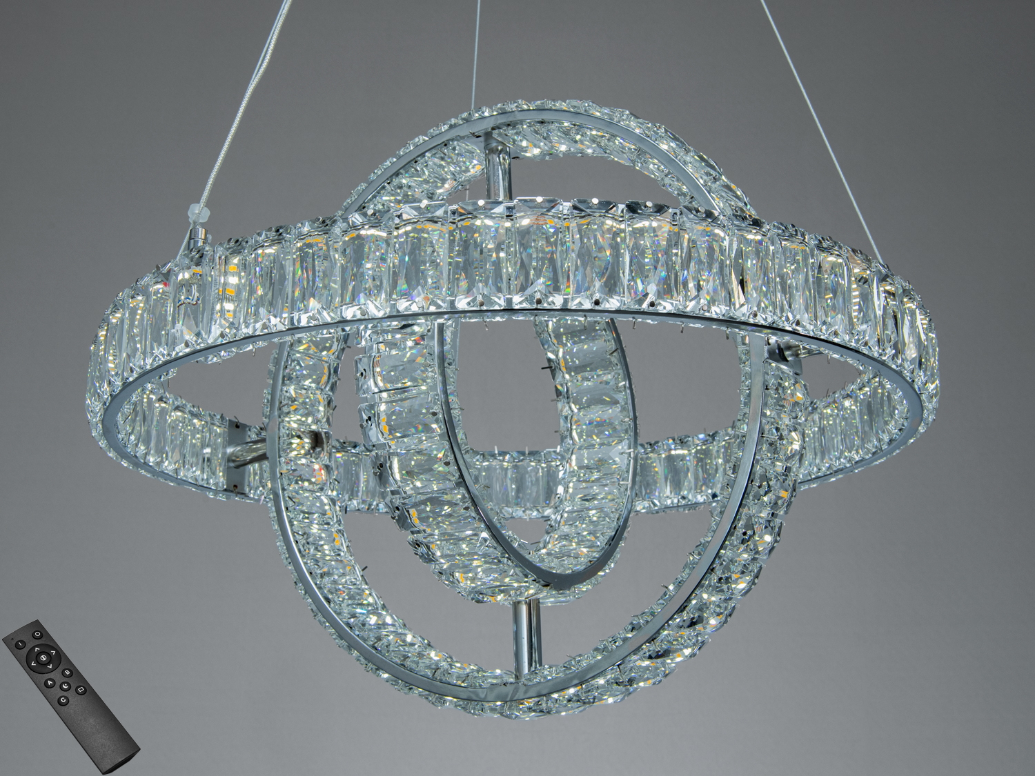 Кришталева світлодіодна підвісна люстра з двома кільцями 88 Вт у хромі створює виразний акцент і водночас забезпечує рівномірне освітлення кімнати до 15 м². Два перехресні кільця з кришталевими гранями підвішені на тонких металевих тросах, а керування яскравістю здійснюється з пульта — це дозволяє підібрати рівень світла під різні сценарії: від м’якого вечірнього до робочого.