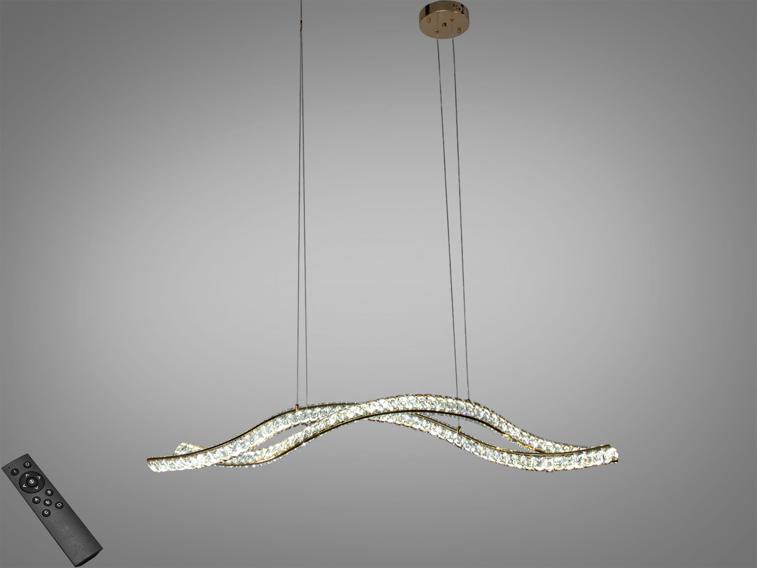 Підвісна люстра Diasha D8947 створює акцентну лінію світла завдяки перехресним хвилям і витягнутій формі. Поєднання хромованого металу та прозорих кришталевих елементів надає світильнику динамічності, що зазвичай пасує сучасним інтер’єрам. LED-модуль 85 Вт передбачає достатній світловий потік для кімнати орієнтовно до 15 м², а пульт керування допомагає комфортно користуватися світлом на відстані.