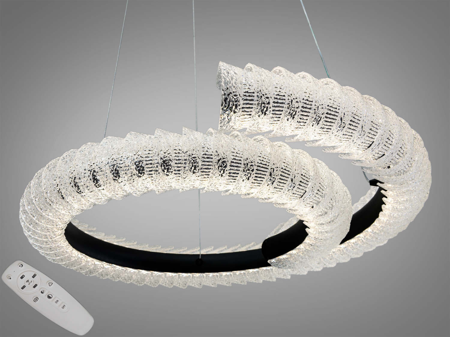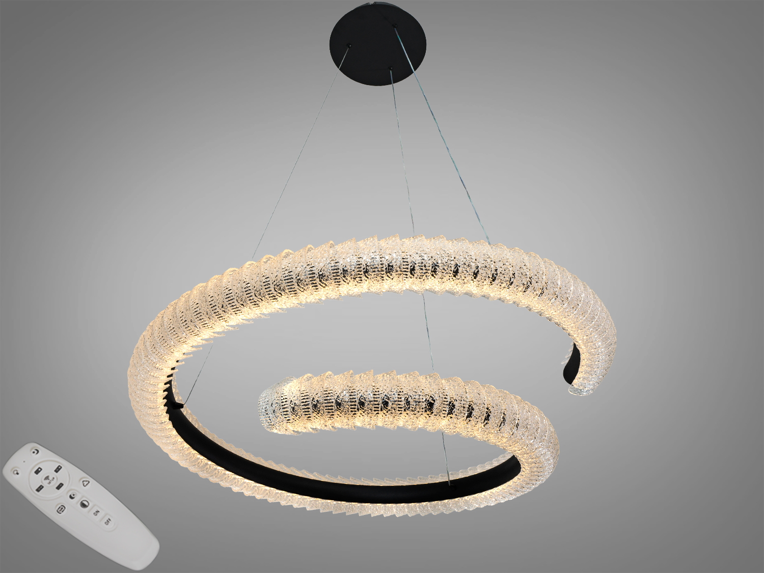 Підвісна світлодіодна люстра з пультом, колір шампань — це сучасний підвісний світильник зі спіральним акриловим контуром, що створює виразне загальне освітлення та м’яку візуальну динаміку. Потужність 132 Вт і світловий потік 7260 лм передбачають ефективне освітлення приміщень площею до приблизно 23 м² за умови стандартної висоти стелі та світлих поверхонь. Доступні варіанти серії: шампань (поточна пропозиція) та чорний.