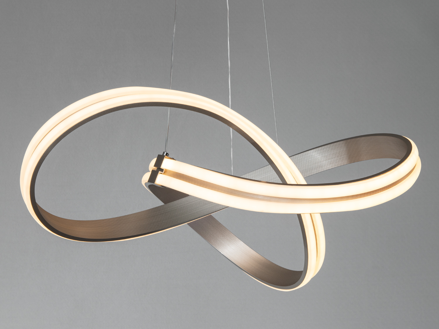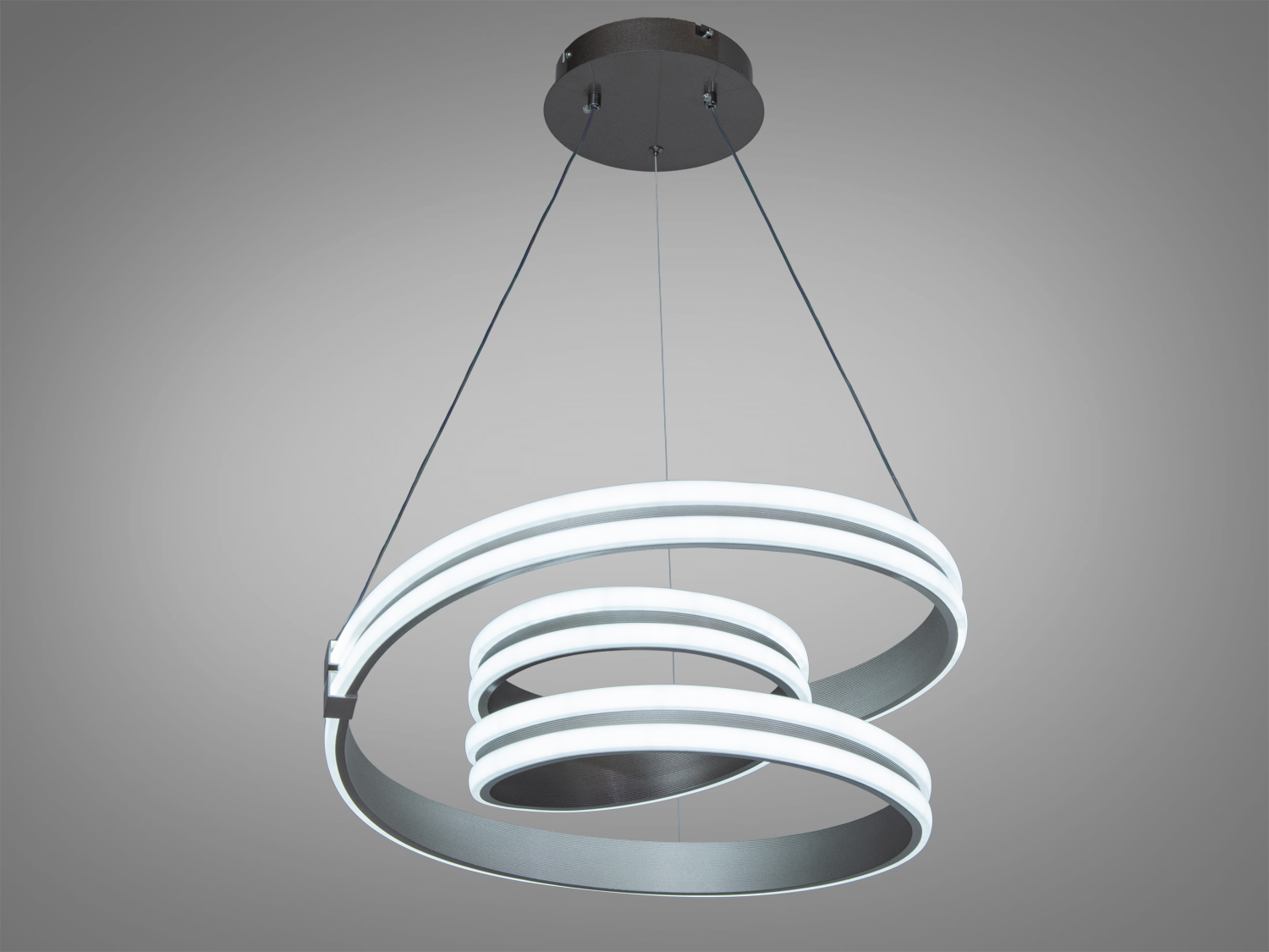Три акрилові кільця різного розміру формують впізнавану геометрію та мʼяко розсіюють світло. У вимкненому стані кільця виглядають напівпрозорими, у теплому режимі дають затишний жовтуватий відтінок, у холодному — чисте біле світло. Каркас виконано з металу та пофарбовано в білий колір, що візуально полегшує люстру і робить її доречною у мінімалістичних просторах. Конструкція для стельового монтажу має невелику висоту, тож підходить і для кімнат з невисокими стелями.