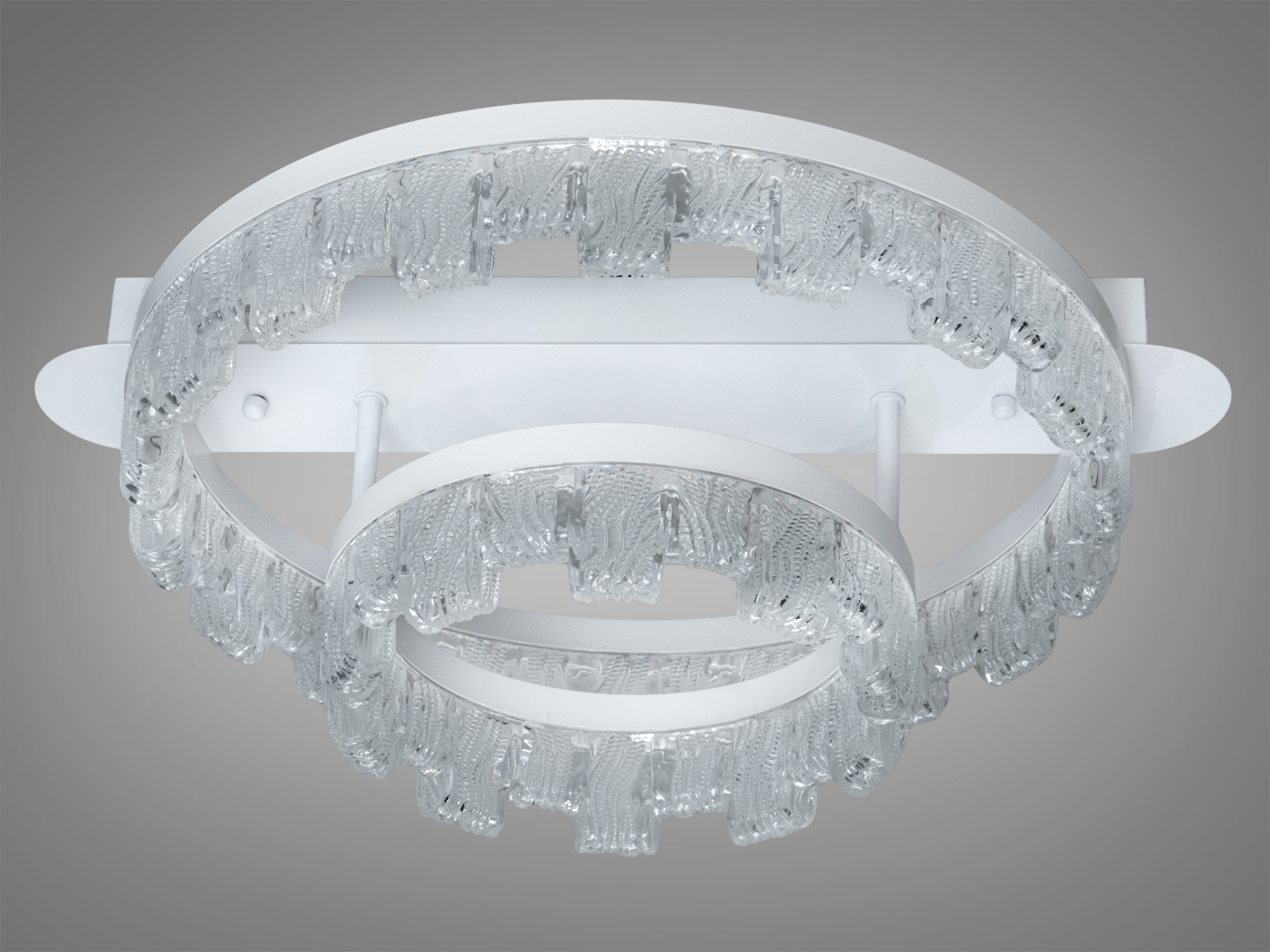 Стельова LED-люстра MX78204-2+2WH створена для рівномірного загального освітлення й виразного акценту в інтерʼєрі. Композиція із чотирьох білих кілець (два більші та два менші) формує об’ємну світлову фігуру, що мʼяко підсвічує простір і візуально полегшує стелю. Розсіювачі з текстурованого акрилу нагадують «крижаний візерунок» і допомагають зменшити сліпіння, роблячи світло комфортним для очей.