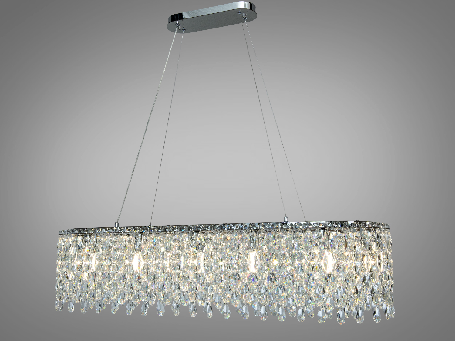 Переваги у використанні: сумісність зі звичними лампами E14, можливість коригування висоти під конкретне приміщення, поєднання кришталю з хромом, що гармонійно працює у класичних та сучасних інтер’єрах. Модель розглядають для оновлення освітлення без складних дизайнерських рішень — за рахунок форми та підвісок вона привертає увагу навіть у спокійних палітрах.