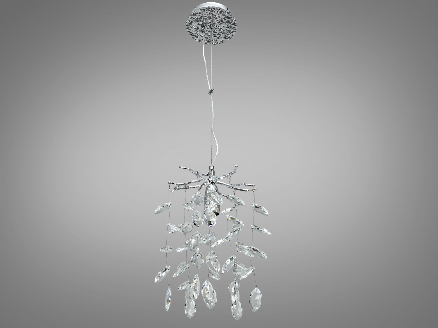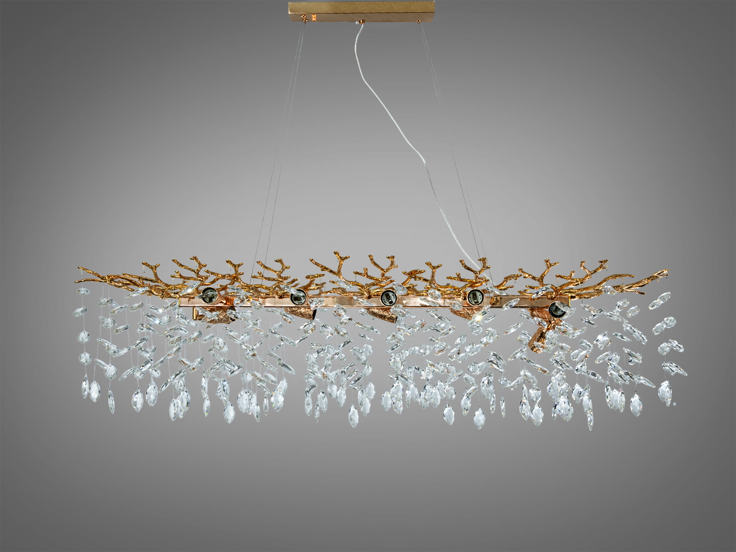 Ця підвісна кришталева люстра створює м’яке багатогранне світло завдяки підвіскам, що нагадують краплі і листя на розгалужених «гілках». Золоте покриття основи підкреслює теплі відблиски кришталю та може працювати як помітний акцент у невеликому інтер’єрі. Конструкція розрахована на чотири лампи з цоколем E14, що за правильного підбору джерел світла зазвичай достатньо для простору приблизно до 8 м².