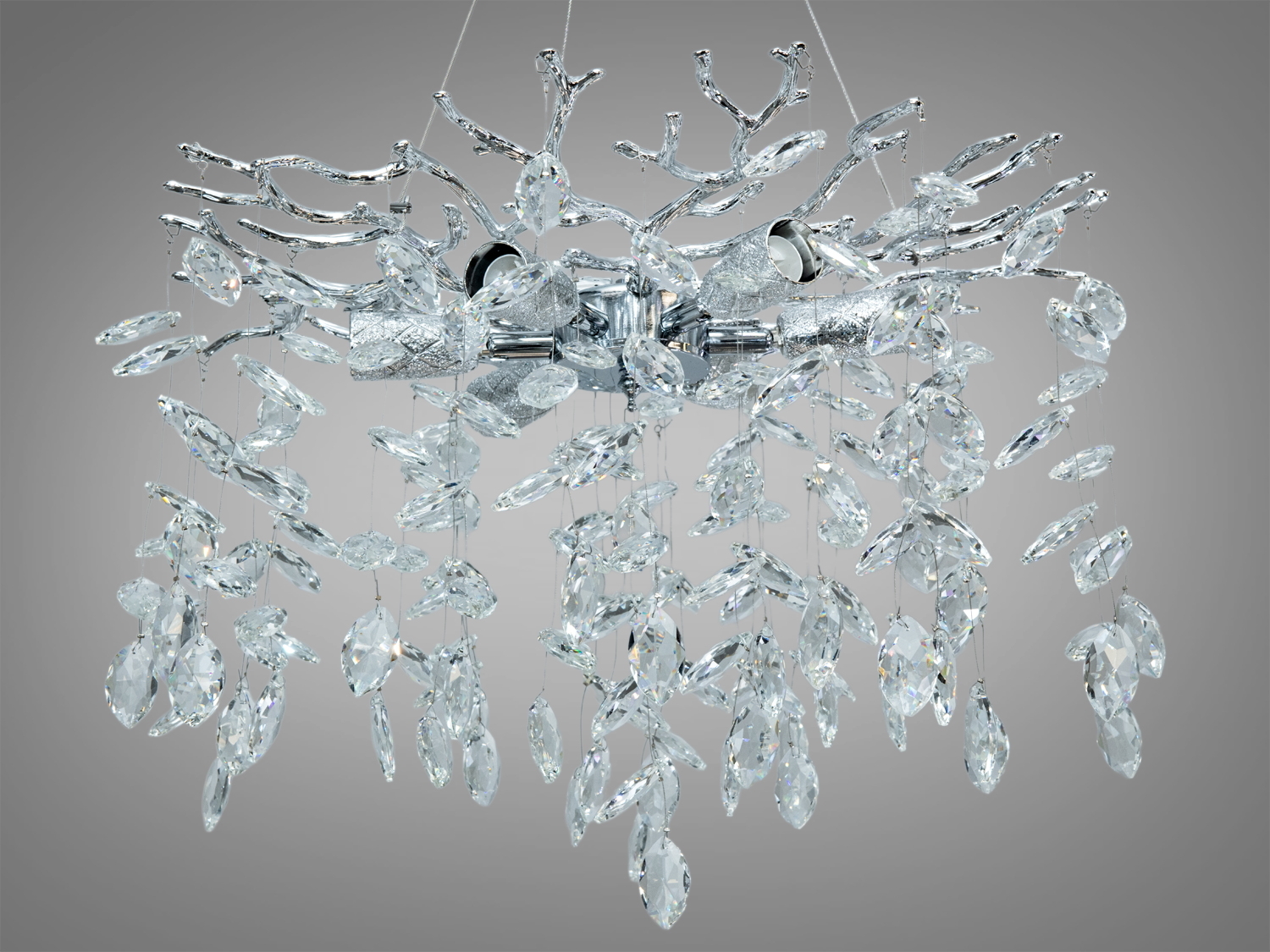 - Кришталеві підвіски у формі крапель і листків заломлюють світло та створюють мерехтливу гру відблисків.