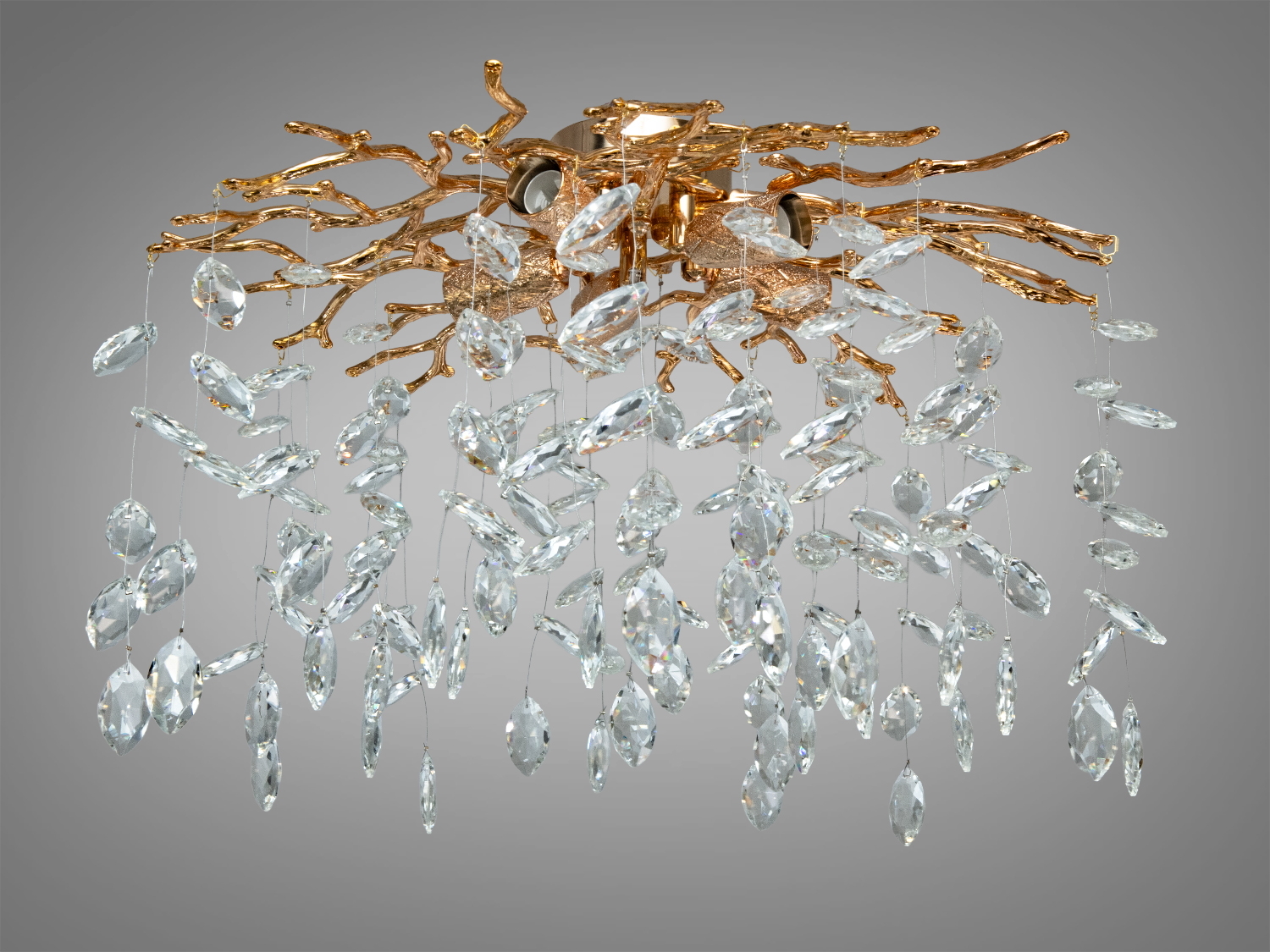 Силует моделі відтворює пластику гліцинії: нитки кришталевих підвісів спадають ярусами та формують виразну об′ємну композицію. Хром працює як дзеркальна підкладка — відбиває світло та підсилює мерехтіння граней, тож навіть м′які лампи дають живу гру відблисків. Каскадна побудова без зайвих декоративних деталей підтримує сучасний прочитаний класики характер та легко інтегрується в різні інтер′єри.