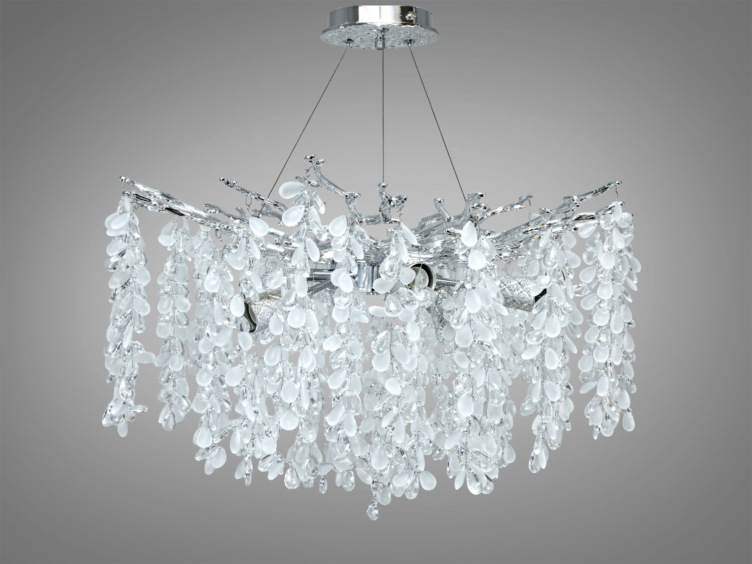 Ця модель поєднує витончені кришталеві підвіски, що нагадують бурульки та гілки гліцинії, з лаконічним білим каркасом. Завдяки 12 патронам E14 люстра пропонує гнучке налаштування яскравості під завдання кімнати: від м’якого акцентного до насиченого загального світла. За умови добору відповідних ламп, освітлення зазвичай вистачає для приміщення приблизно до 24 м².