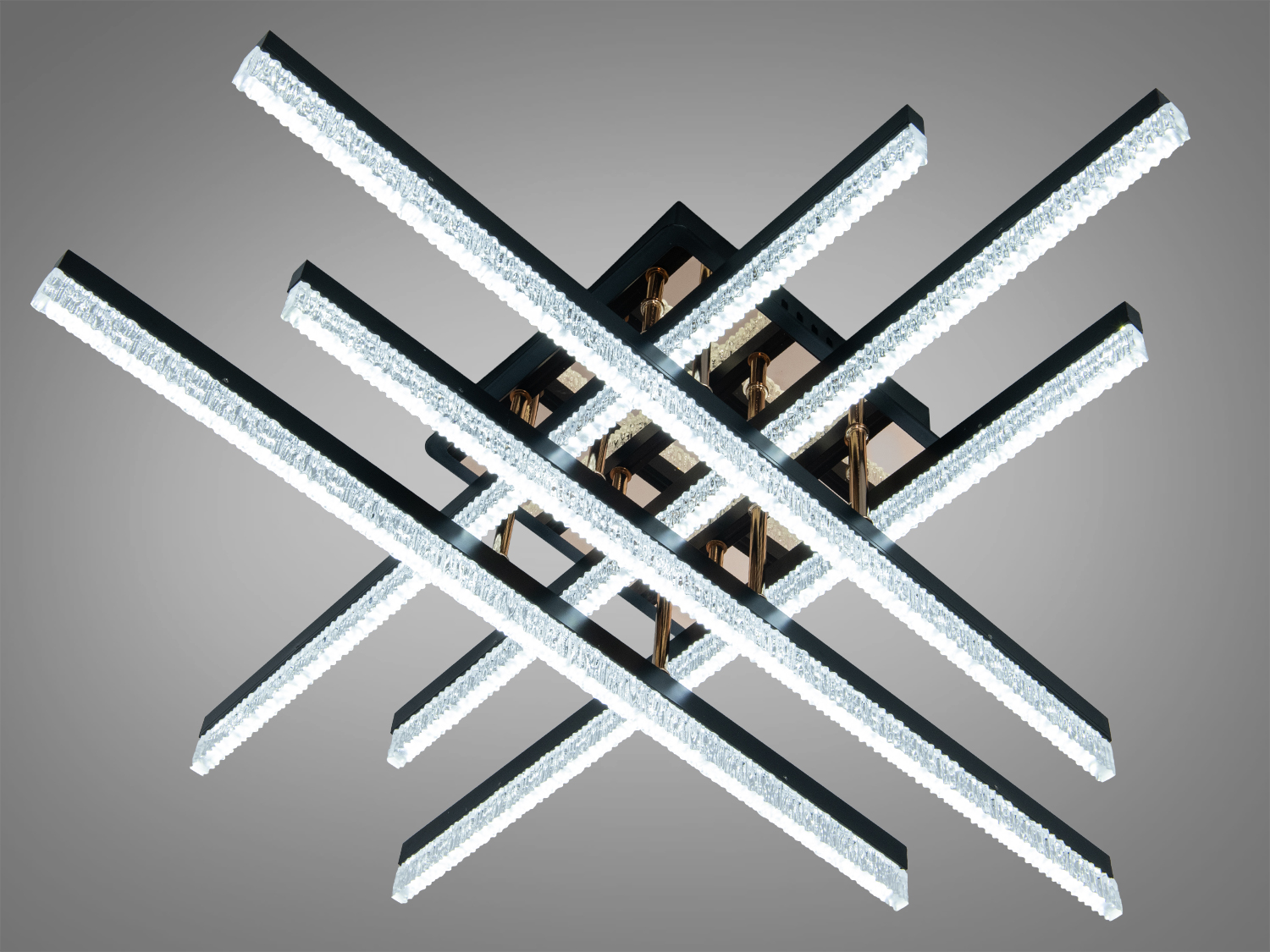 Лаконічна геометрія п’яти світлових ліній підкреслює сучасний, мінімалістичний або лофт стиль. Чорні троси майже непомітні, завдяки чому у фокусі залишається графічний малюнок світла. Комбінація чорного з золотом додає візуальної глибини й акцентує простір без перевантаження декором.