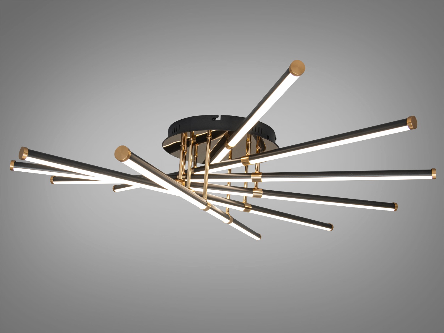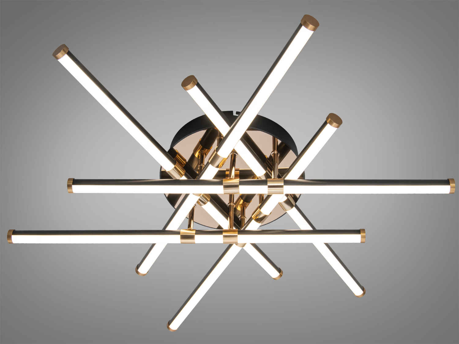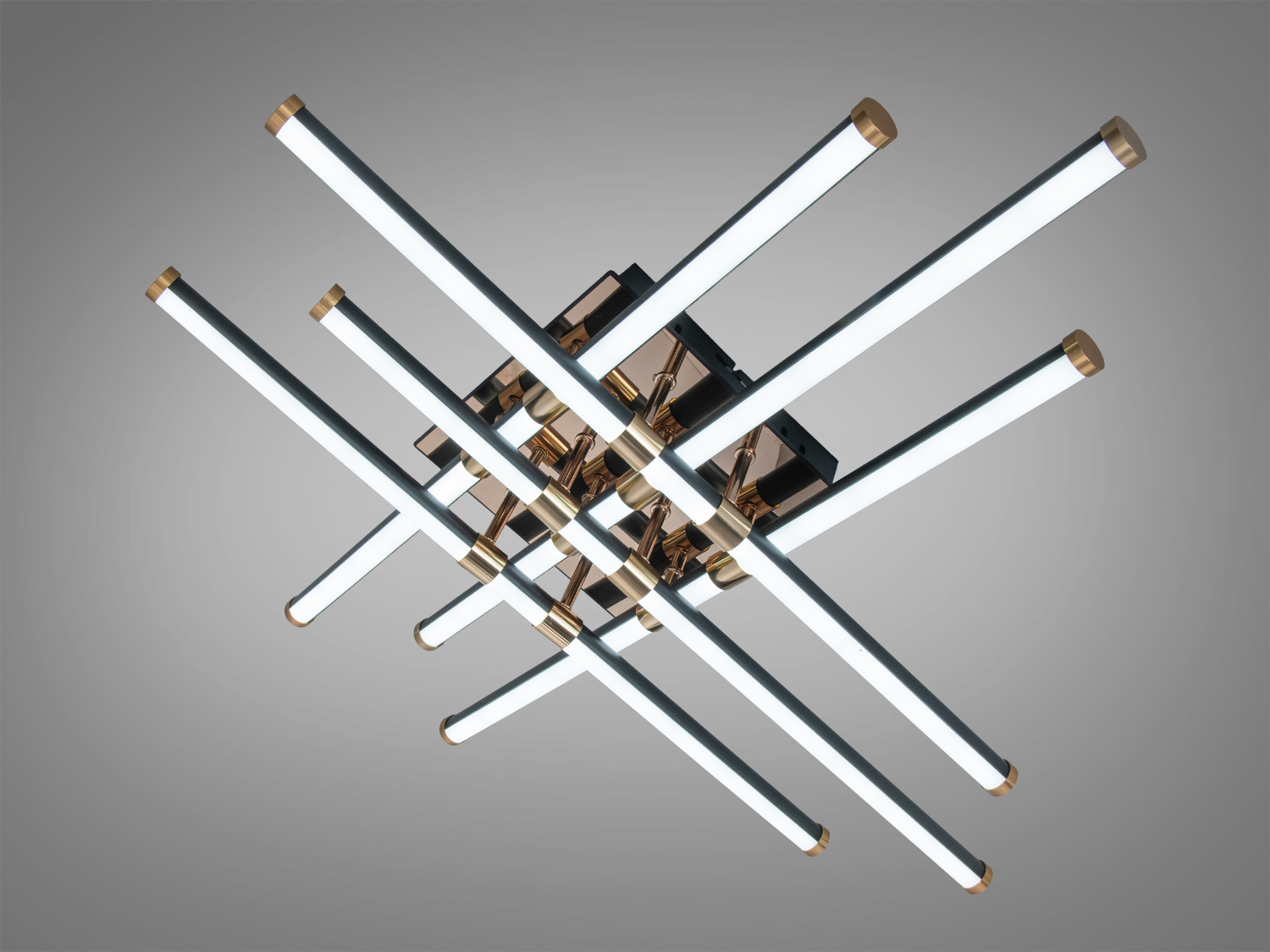 Корпус виконано у чорному матовому відтінку, що пасує до сучасних інтер′єрів і легко комбінується з деревом, бетоном та світлими стінами. Світлові модулі формують геометричну композицію, яка читається як сучасний акцент у просторі. Використано поєднання металу для надійної основи та акрилових розсіювачів для м’якого рівномірного світла без різких відблисків. Конструкція виглядає акуратно біля стелі та не перевантажує кімнату.