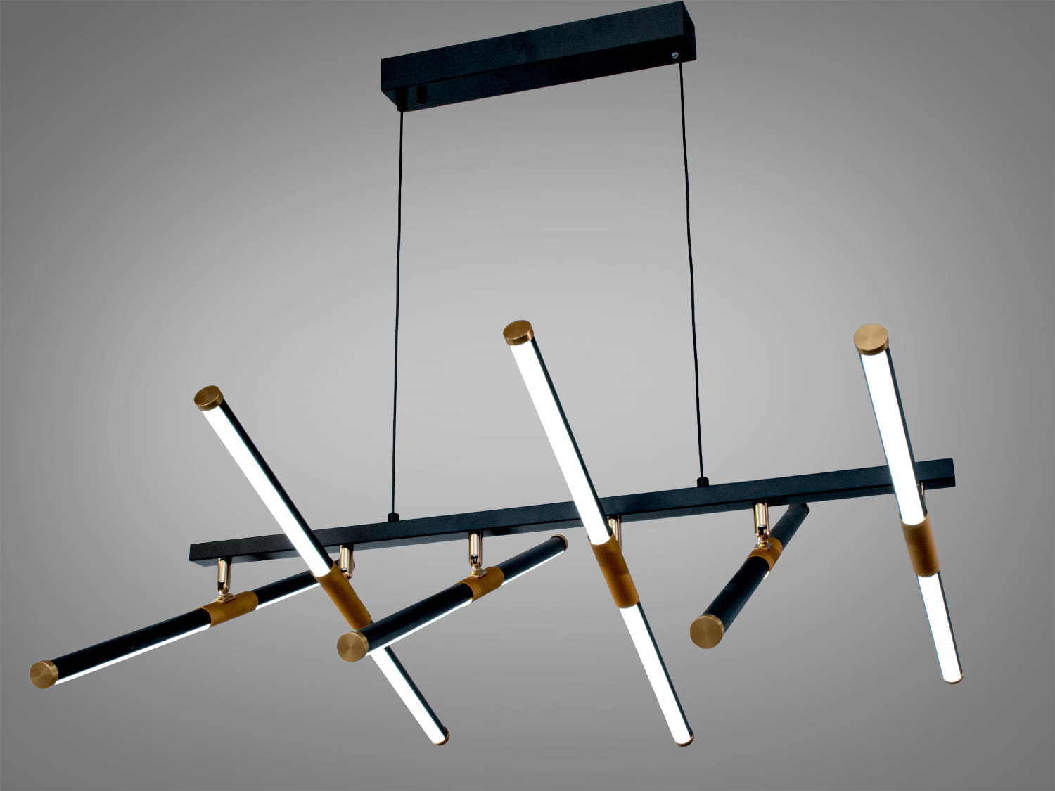 Світлодіодна підвісна люстра 140 Вт у чорному кольорі створює виразне загальне освітлення для кімнат до 25 м². Композиція з кількох тонких горизонтальних світлодіодних планок, що розходяться від центрального вузла та підвішені на тросах, формує динамічний акцент у сучасних і мінімалістичних інтер′єрах. Модель працює без пульта — керування здійснюється стандартним настінним вимикачем.