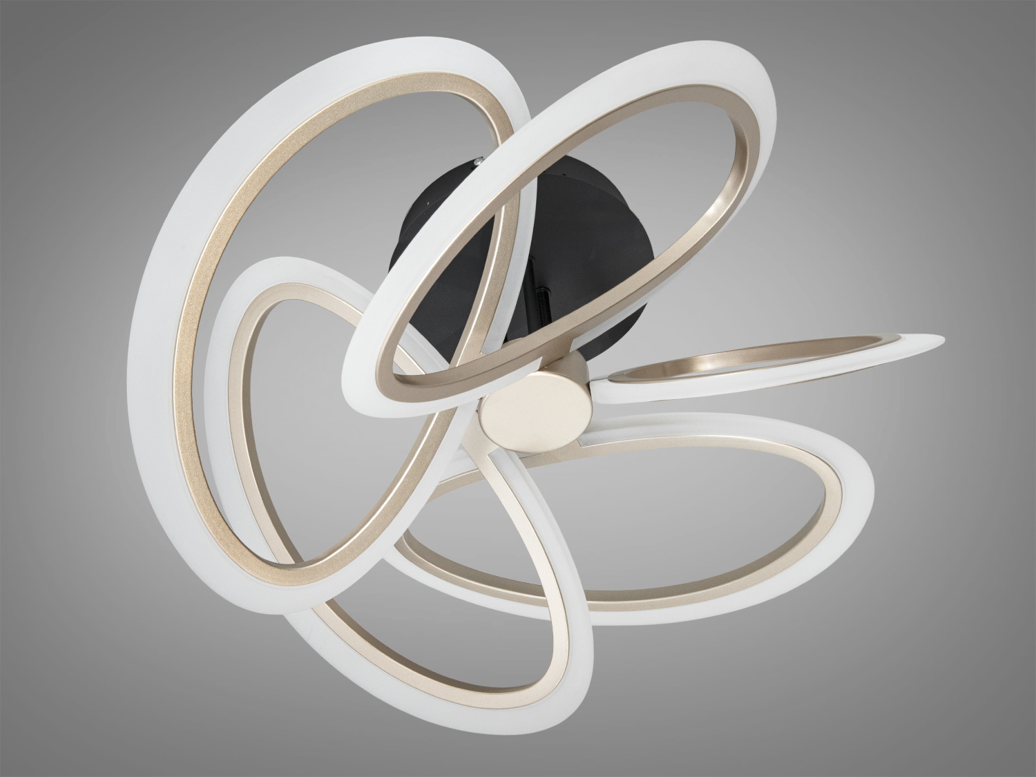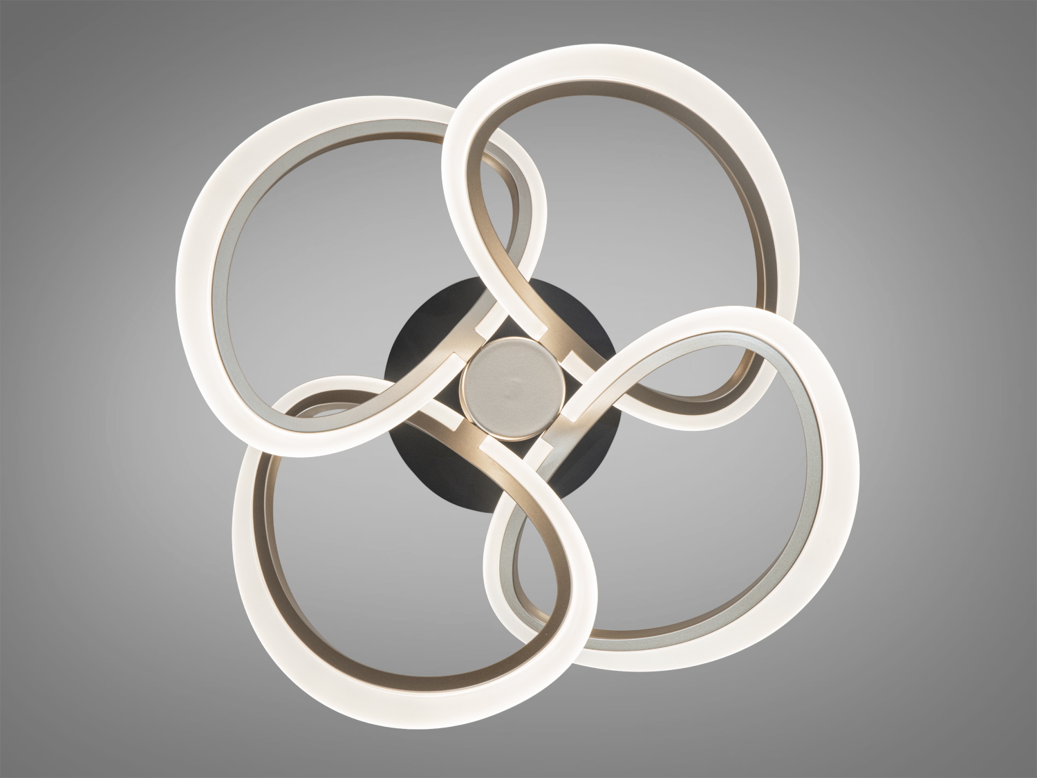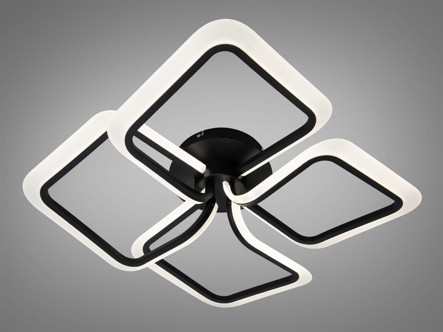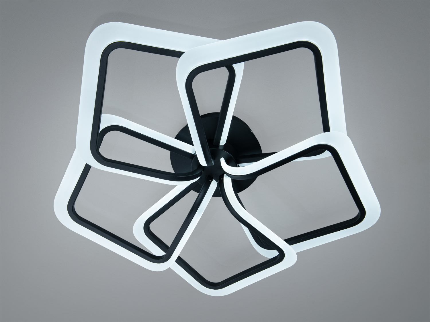 Візуальна концепція люстри спирається на п′ять геометричних контурів, які формують композицію, схожу на стилізовану квітку. Поєднання чорних і білих елементів створює помітний, але стриманий акцент. Плавні лінії й перетини квадратних форм додають об′єму та глибини, тому світильник виглядає виразно як у вимкненому стані, так і під час роботи. Низький профіль підходить для приміщень зі стандартною висотою стелі, а компактна платформа кріплення забезпечує акуратне прилягання до поверхні.
