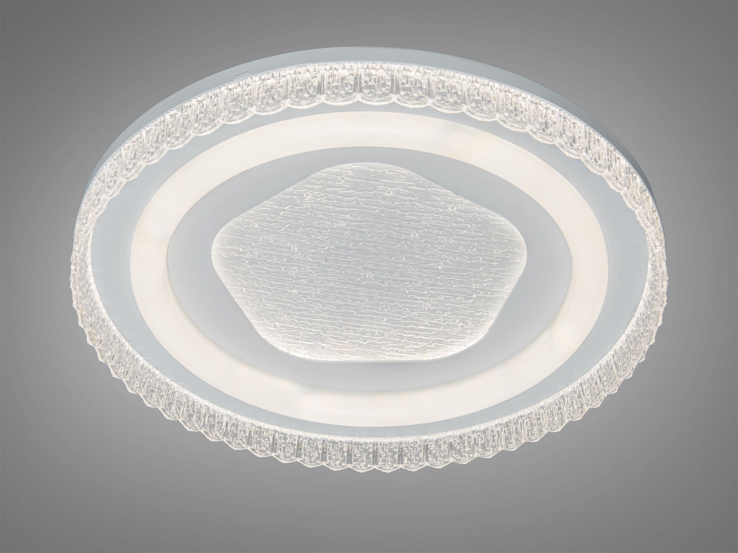 Стельовий світлодіодний світильник Diasha 85 Вт у форматі білого кола створює базове рівномірне освітлення для житлових і робочих приміщень. Матовий плафон м’яко розсіює потік, а прозорий кант із кришталевим ефектом додає глибини світіння без різких відблисків. Накладний монтаж зберігає висоту кімнати, тому модель часто обирають для низьких стель і мінімалістичних інтер’єрів. Світильник працює від звичайного настінного вимикача; пульт у комплект не входить.