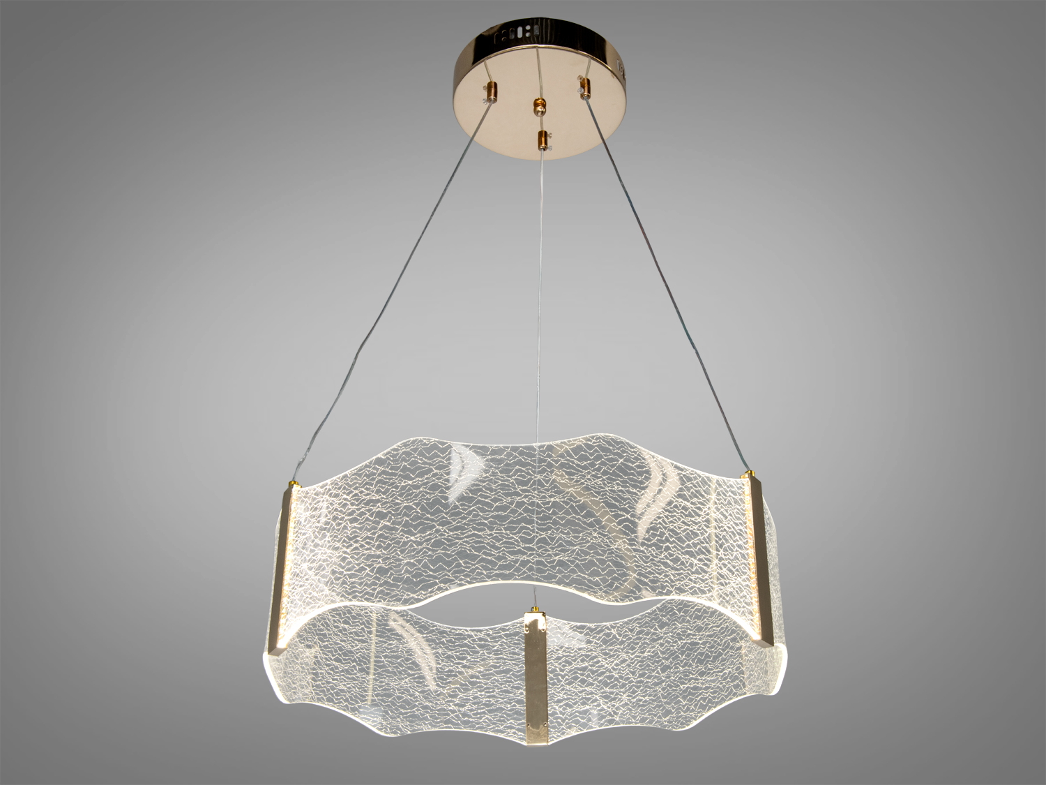 Візуальний характер світильника формує прозорий хвилястий акриловий абажур із тонким геометричним візерунком. Він пом’якшує світловий потік і зменшує сліпіння, створюючи комфортну атмосферу. Золотисте оздоблення додає теплий відтінок зовнішньому вигляду та легко поєднується з латунню, теплими металами, світлим деревом і каменем. Металеві елементи кріплення забезпечують надійну фіксацію, а тонкі троси підтримують «повітряність» композиції.