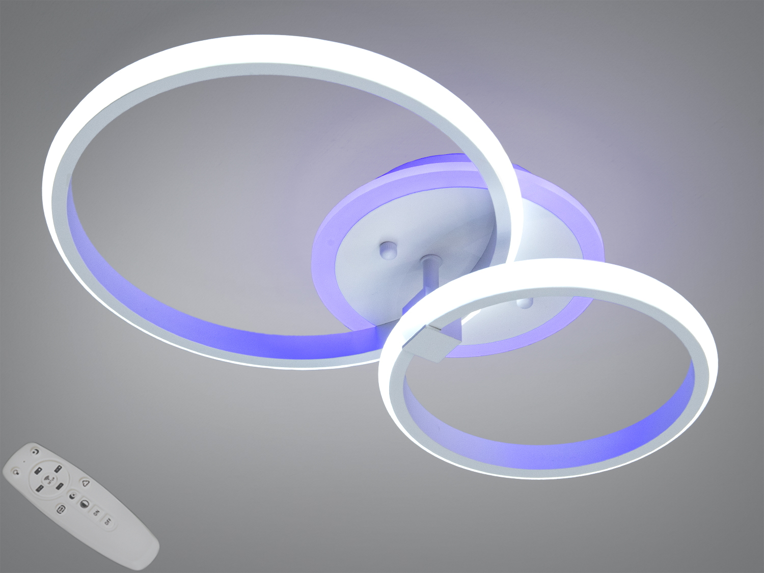Ця стельова світлодіодна люстра у білому кольорі поєднує виразний сучасний дизайн та гнучкі сценарії освітлення. Завдяки потужності 135 Вт вона розрахована орієнтовно на до 23 м² і може створювати яскраве загальне світло або м’який вечірній настрій. Модель підтримує керування з пульта та настінного вимикача, має вбудований електронний димер із плавним регулюванням та режимом нічника ~5%. Основне світло змінює колірну температуру: тепле, нейтральне або холодне, а підсвічування основи додає акцентні відтінки синього, червоного і рожевого.